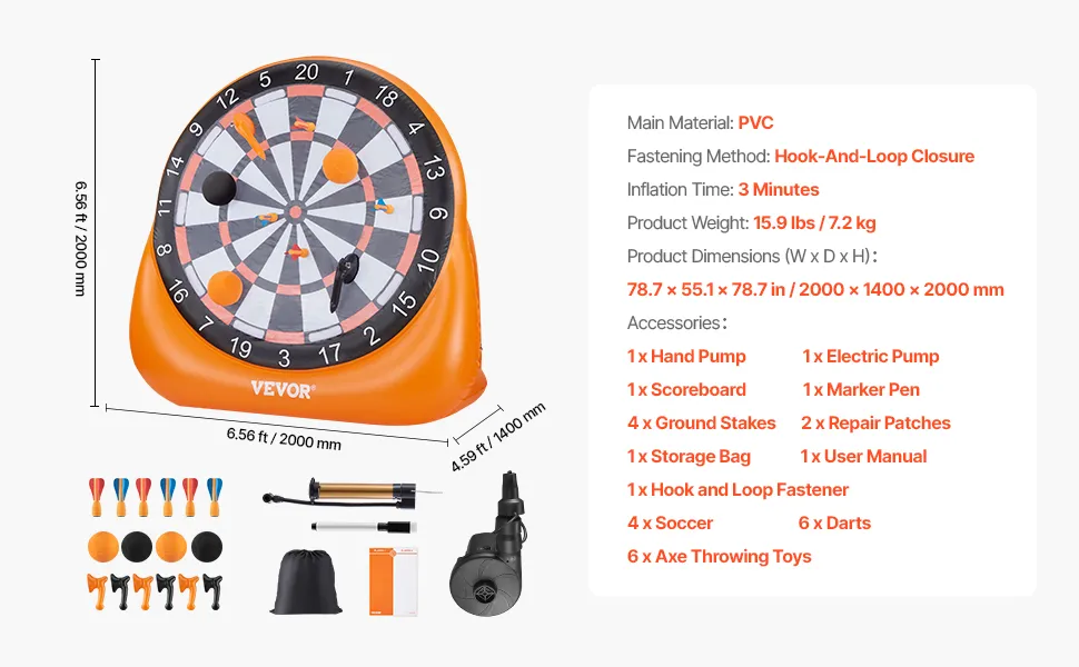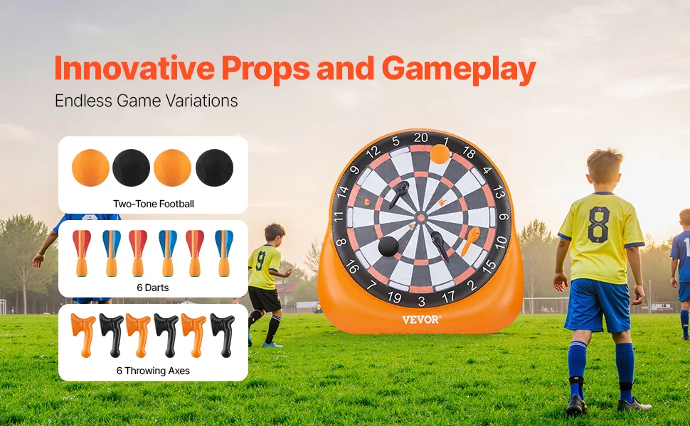 Con un mix di calcio, freccette e asce, questo set porta una varietà extra al tuo gioco, rendendolo più emozionante e divertente. Raduna i tuoi amici e goditi la sfida del gioco di freccette e calcio gonfiabile.