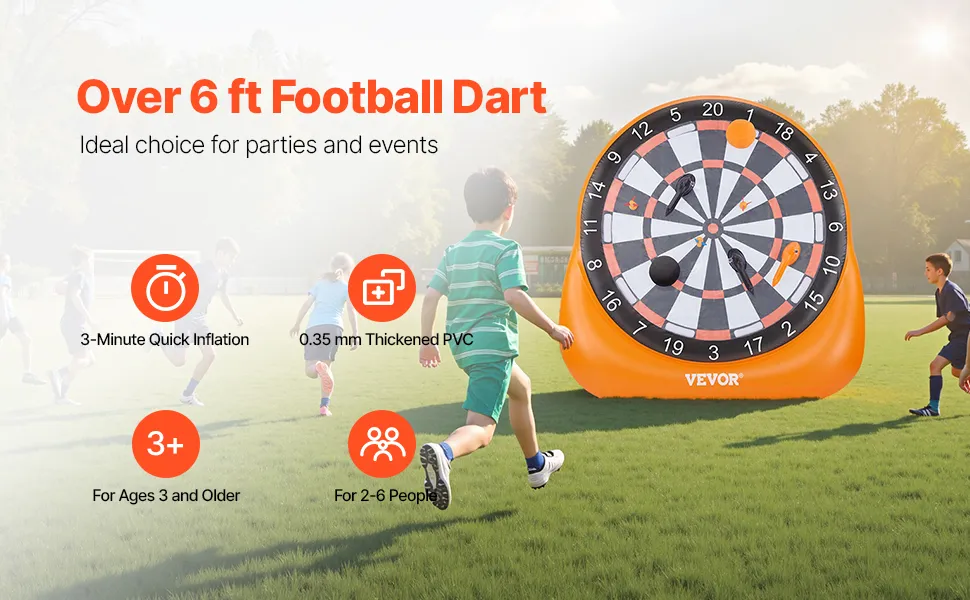Ideale per il divertimento all'aperto: che si tratti di una riunione di famiglia, di un barbecue, di una gita in campeggio o di una festa di compleanno, questo gioco è un'ottima aggiunta a qualsiasi evento. Il gigantesco bersaglio gonfiabile per freccette da calcio all'aperto è anche un regalo divertente per le festività come la festa dei bambini, Natale o Capodanno, offrendo ore di intrattenimento per tutte le età