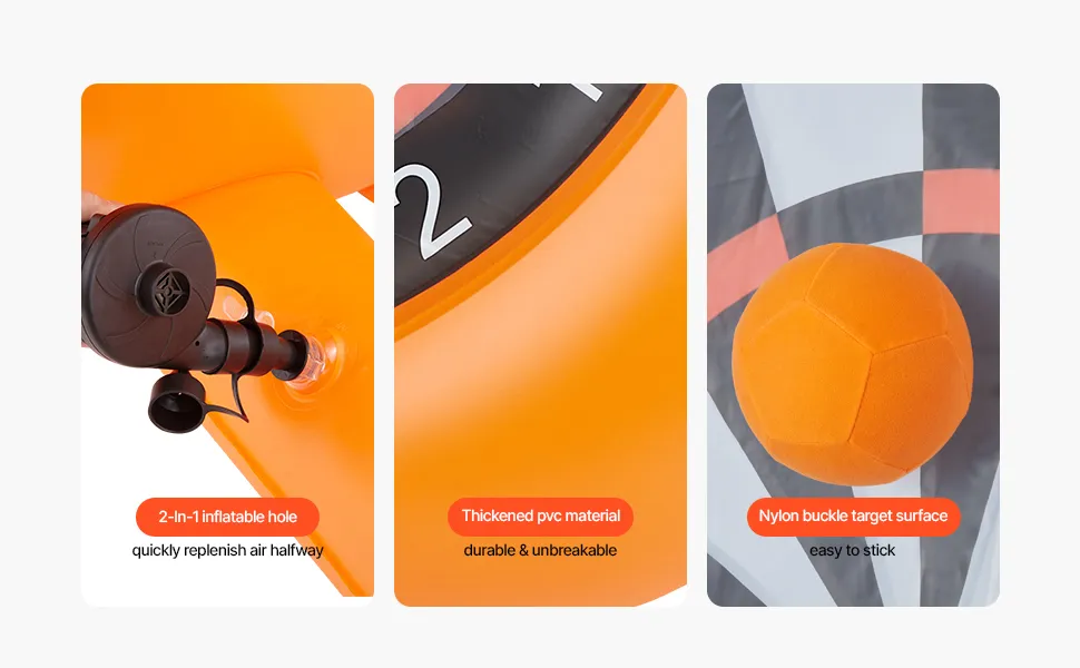 Con fori gonfiabili 2 in 1, materiale in PVC resistente e una superficie bersaglio con fibbia in nylon, questo bersaglio gonfiabile per freccette è progettato sia per la facilità d'uso che per una lunga durata. È costruito per essere sicuro e divertente per tutti.