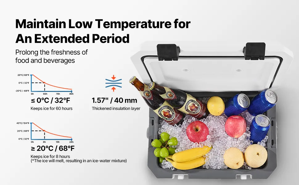 Raffreddamento a lunga durata: con uno strato isolante spesso 40 mm, mantiene il ghiaccio fino a 60 ore a temperature ≤ 0℃ / 32℉ e fino a 8 ore a temperature ≥ 20℃ / 68℉. N.B. Per ottenere risultati ottimali, evitare la luce solare diretta e utilizzare almeno il 40% di ghiaccio rispetto al volume totale