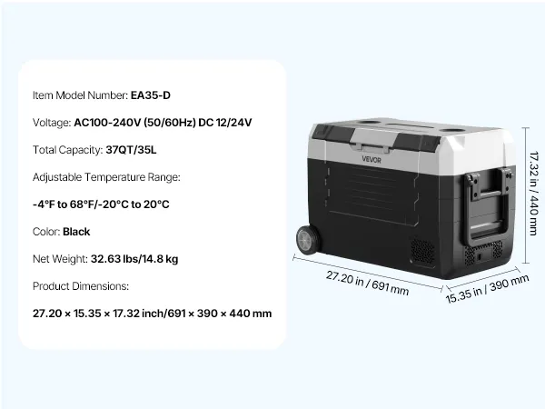 Questo frigorifero portatile per auto con una capacità di 35 litri mantiene freschi cibi e bevande anche in viaggio. Due zone separate consentono di raffreddare le bevande e congelare gli alimenti. Ideale per viaggi su strada, campeggio, battute di pesca e lavoro all'aperto.