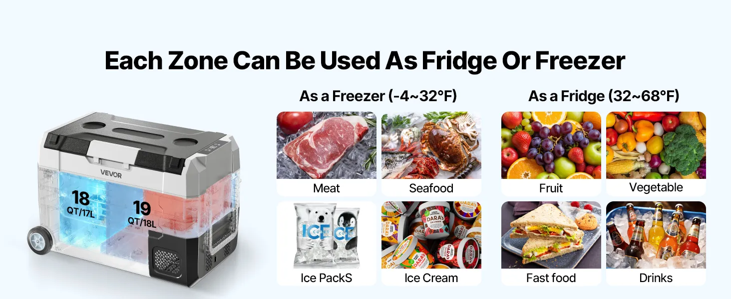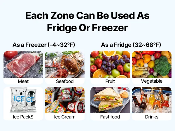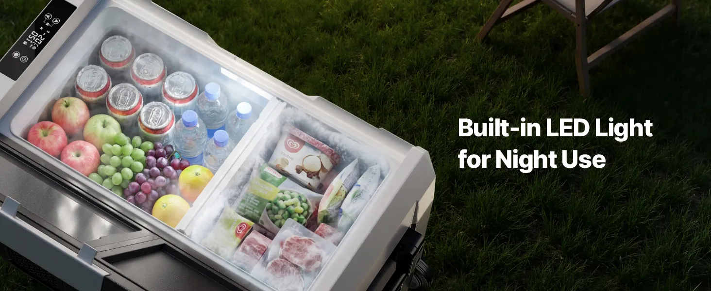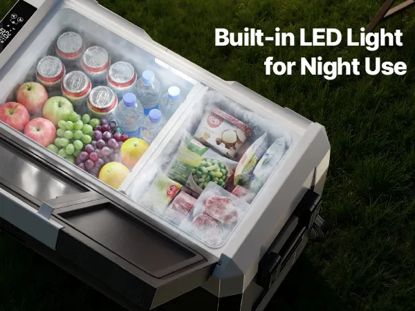 Controllo a doppia zona: Il frigorifero portatile a compressore è dotato di due zone indipendenti che raffreddano le bevande e congelano gli alimenti contemporaneamente. Ogni zona può essere impostata da -20 °C a 20 °C, consentendo la conservazione efficiente di diversi alimenti