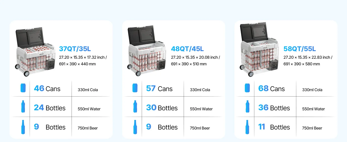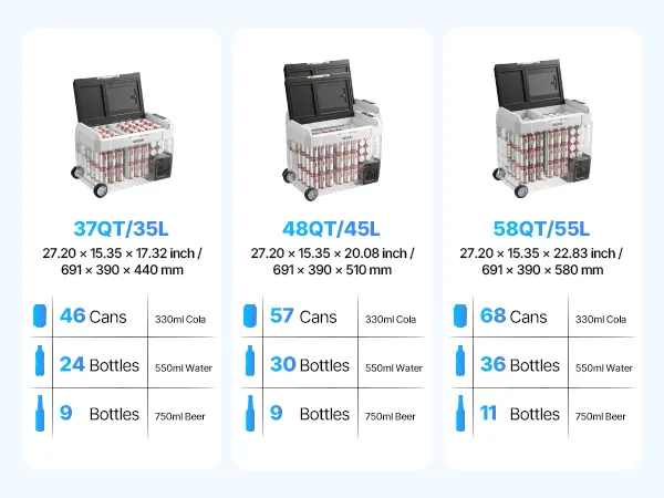 Ampia capacità: Con una capacità di 35 litri, il nostro frigorifero portatile a batteria offre ampio spazio per pasti, bevande, snack e carne, ideale per gite in campeggio, weekend fuori porta, feste ed escursioni in barca