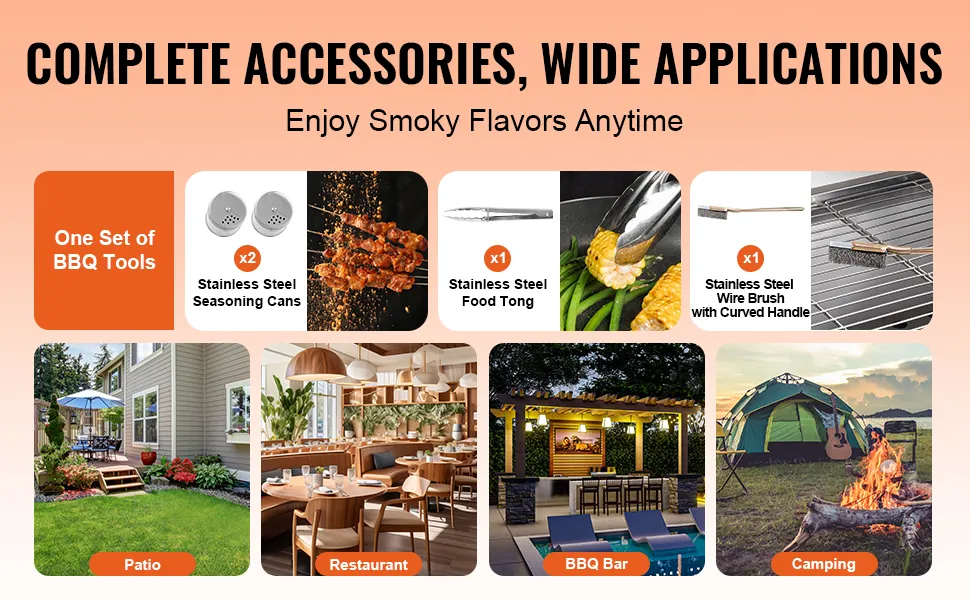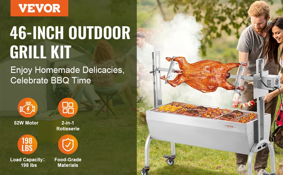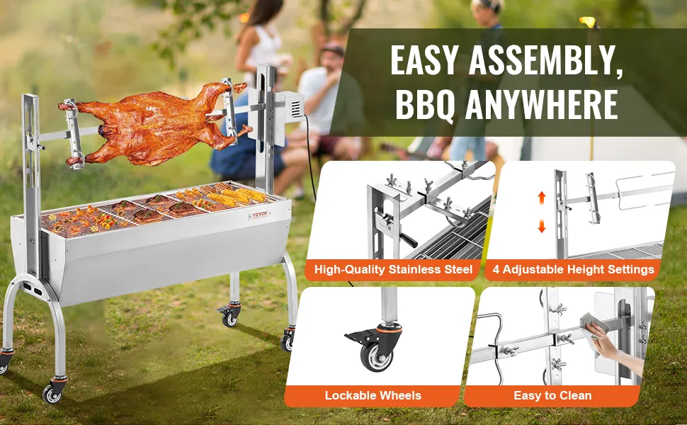 Design intuitivo: la griglia girarrosto in acciaio inossidabile è dotata di 4 ruote rimovibili e bloccabili che facilitano lo spostamento e forniscono maggiore stabilità durante la grigliatura. Inoltre viene fornito con 2 bottiglie di spezie, pinze e una spazzola, che lo rendono la griglia perfetta per fiamme libere e grigliate al girarrosto.