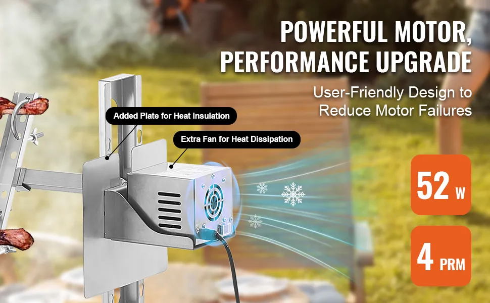 È dotato di un potente motore da 52 watt che fa ruotare il girarrosto senza sforzo a 4 giri al minuto. Sono inclusi anche un pannello isolante termico e una ventola, che garantiscono un eccellente isolamento e raffreddamento.