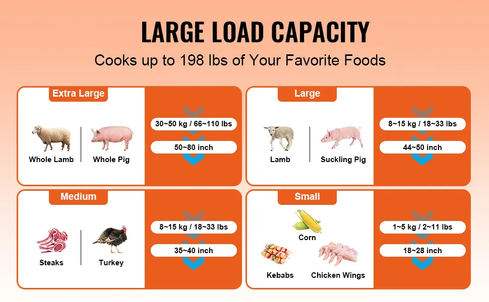 Elevata capacità di carico: questo set per barbecue ha una capacità di carico totale di 90 kg (198 libbre), con una rete per griglia che può contenere 60 kg (132 libbre) e viene fornito con una forchetta per griglia automatica. Si prega di notare che la capacità di carico massima effettiva dopo la preparazione del cibo è di 30 kg di peso netto.