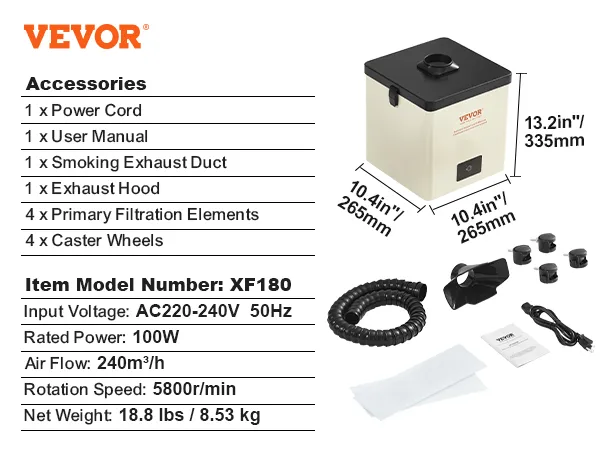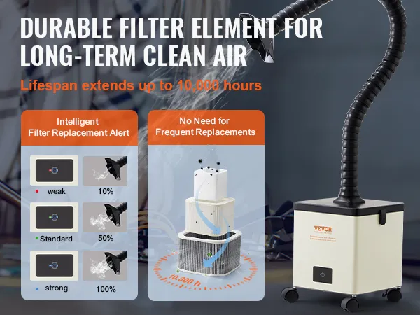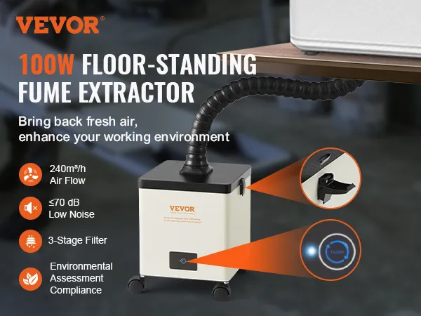 Aspiratore fumi di saldatura VEVOR, con motore da 100W e portata d'aria di 240m³/h, è in grado di rimuovere rapidamente fumi e particelle nocive. Il filtro a 3 strati mantengono il tuo spazio di lavoro pulito, sicuro e sano.
