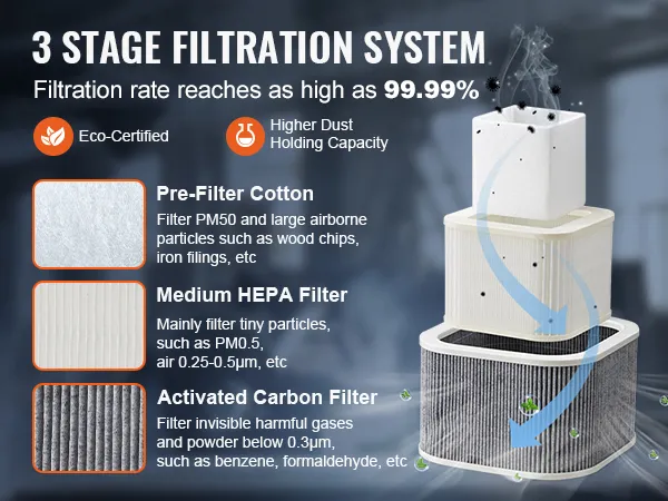 Il nostro design di filtrazione a tre strati può catturare efficacemente il 99,99% dei gas nocivi e delle mini impurità.