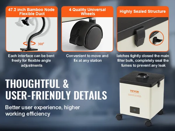 Il tubo flessibile ca. Pieghevole da 120 cm, include 4 ruote universali di alta qualità (di cui 2 con freno). La struttura altamente sigillata assicura che i fermi metallici chiudano saldamente il filtro principale, sigillando completamente i fumi per evitare eventuali perdite.