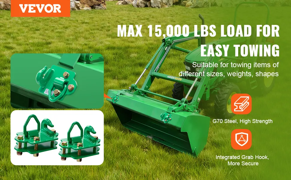 Elevata capacità di carico: i ganci della benna del trattore sono realizzati in acciaio di grado G70, che offre eccezionale resistenza e durata. Con una capacità di carico massima di 15.000 libbre, offre un'ampia gamma di traino e può ospitare varie dimensioni, pesi e forme di oggetti trainati.