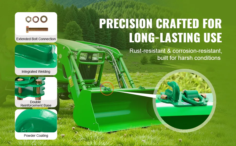 Durevole e affidabile: i ganci del trattore presentano connessioni strutturali precise e sono fissati con una base a doppio spessore per garantire stabilità durante le operazioni di traino. La superficie è rivestita con polvere verde per una maggiore protezione.