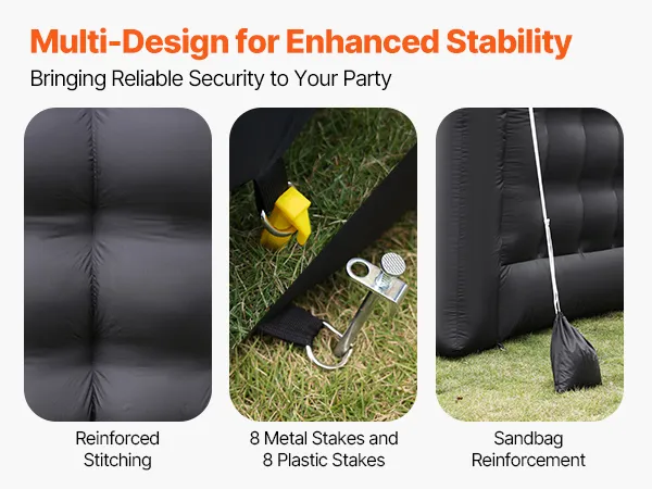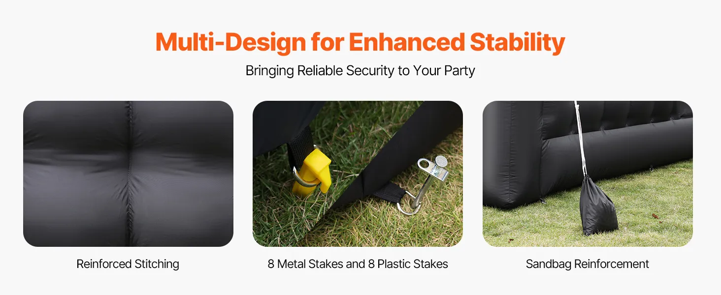 • Design stabile: presenta cuciture rinforzate e numerosi picchetti per un ancoraggio sicuro, oltre a sacchi di sabbia appesantiti per garantire che la tenda gonfiabile da pub rimanga stabile durante l'uso in vari ambienti esterni.