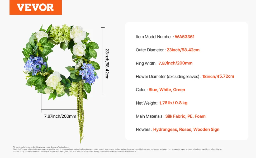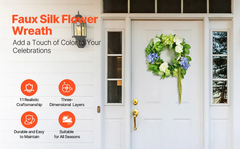 VEVOR Ghirlanda Decorativa Artificiale, 58,42 cm, Blu Bianco Verde, Decorata con Ortensie, Rose, Bacche, Viti, Ghirlanda Tutto l'Anno, Decorazione Interni Esterni, Pareti di Casa, Finestre e Festival