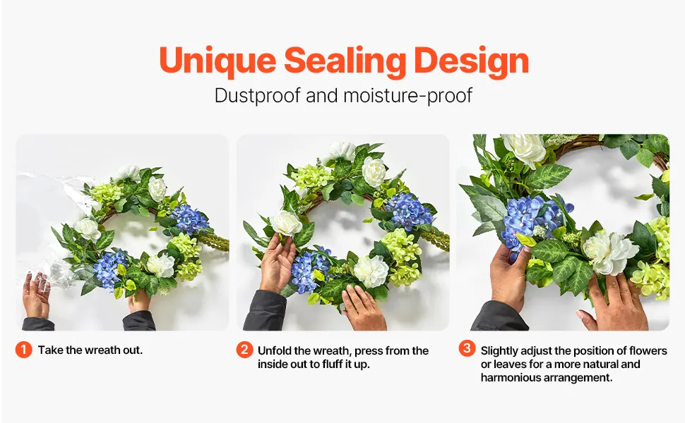 Si prega di estrarre la corona interna e di aprirla. Premere dall'interno verso l'esterno. Raddrizzare ogni fiore e foglia, assicurando un aspetto uniforme e completo. Installare ganci o chiodi nella posizione desiderata, quindi appendere la corona per completare la decorazione.
