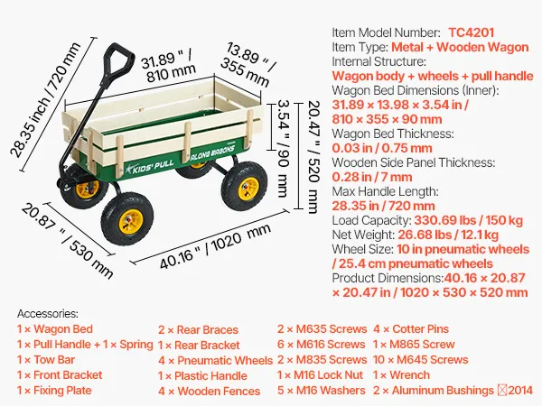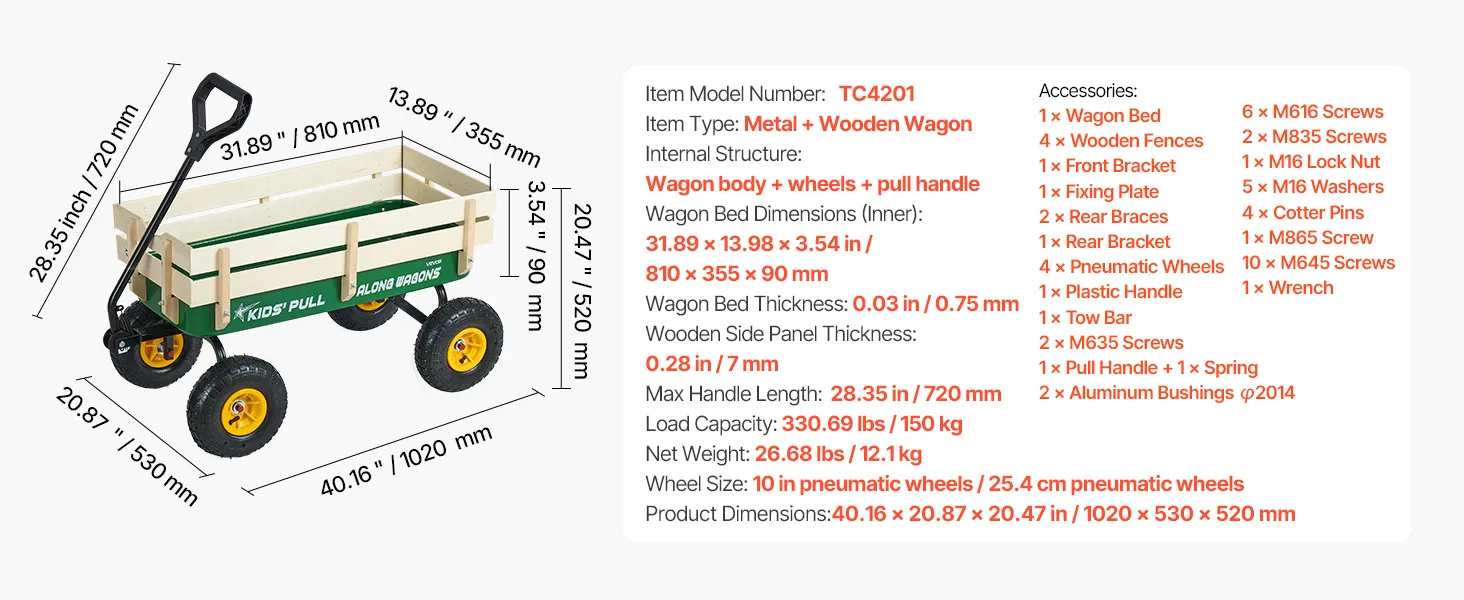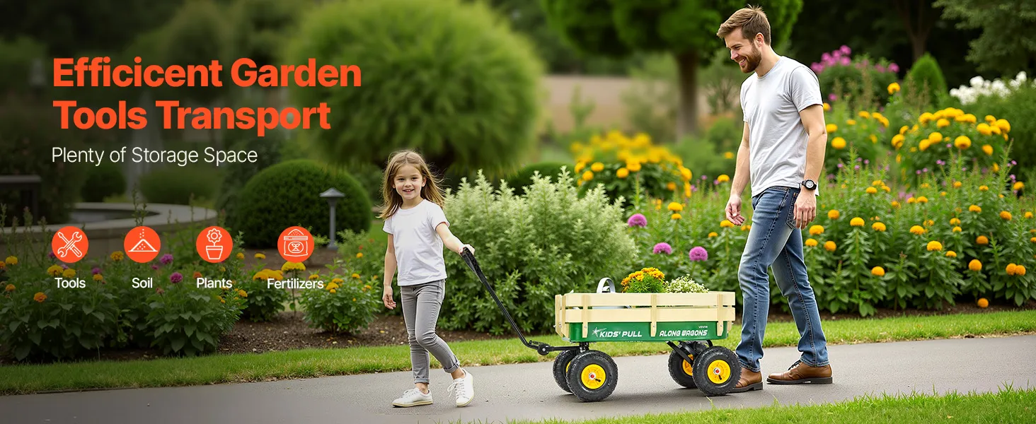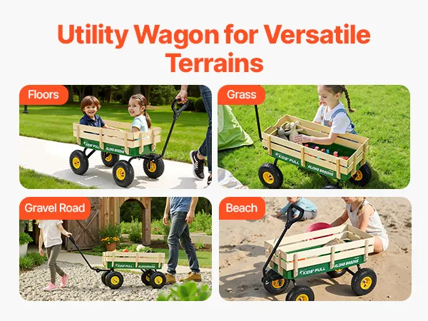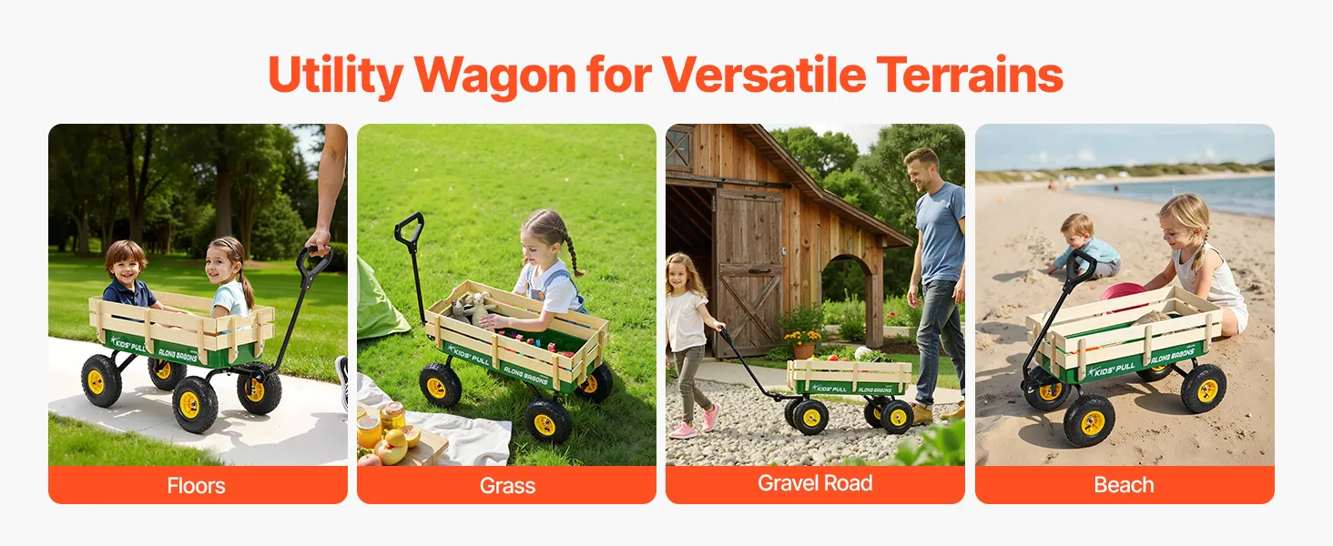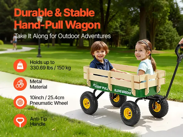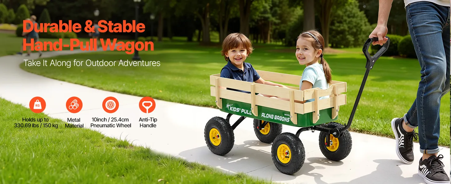 VEVOR Carretto da Traino per Bambini da 101 cm con Pannelli in Legno e Maniglia, Supporta Fino a 150 kg, Carrello Multiuso per Tutti i Terreni, Regalo di Compleanno per Bambini, Giardinaggio, Verde