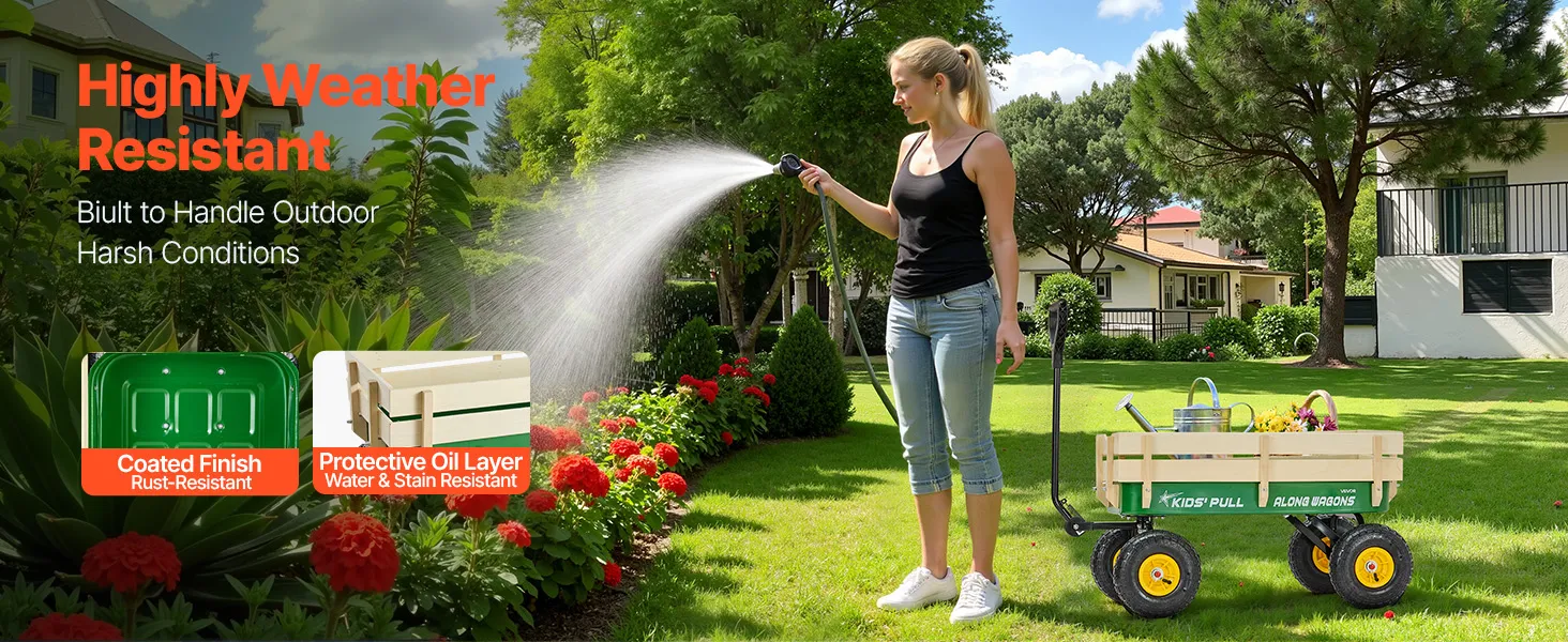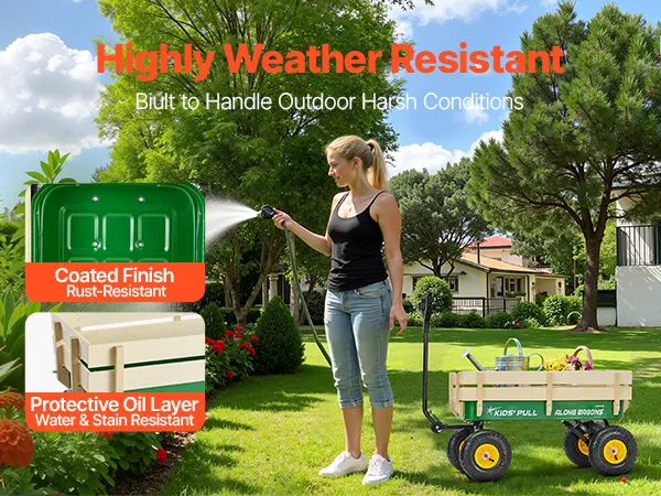 Realizzato in acciaio al carbonio e legno massello, il carrello per bambini è trattato con una finitura a olio e vernice per resistere alle intemperie. Resiste facilmente alla pioggia, all'esposizione al sole e alle intemperie. Grazie alla sua resistenza a ruggine, acqua e macchie.