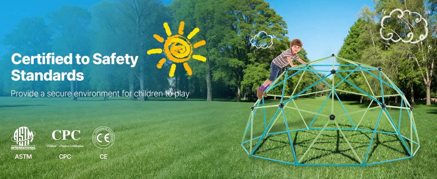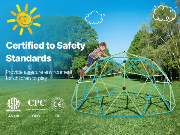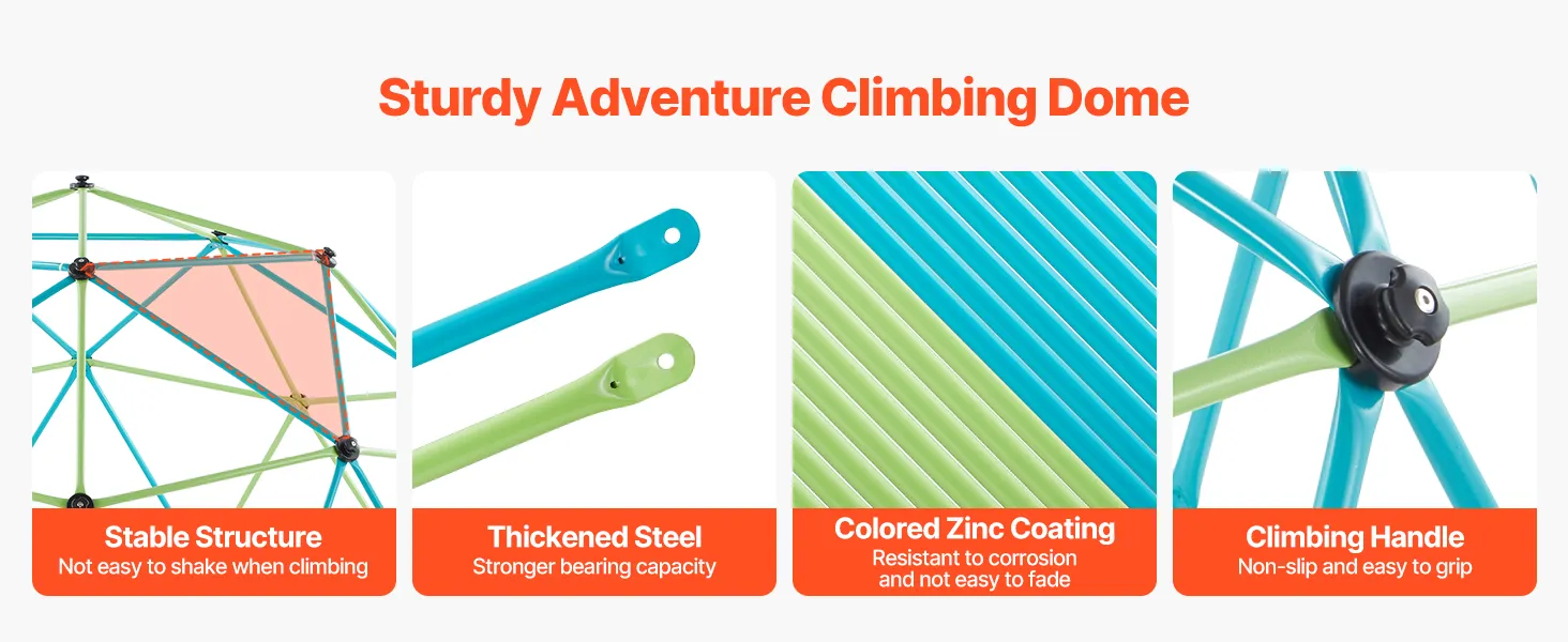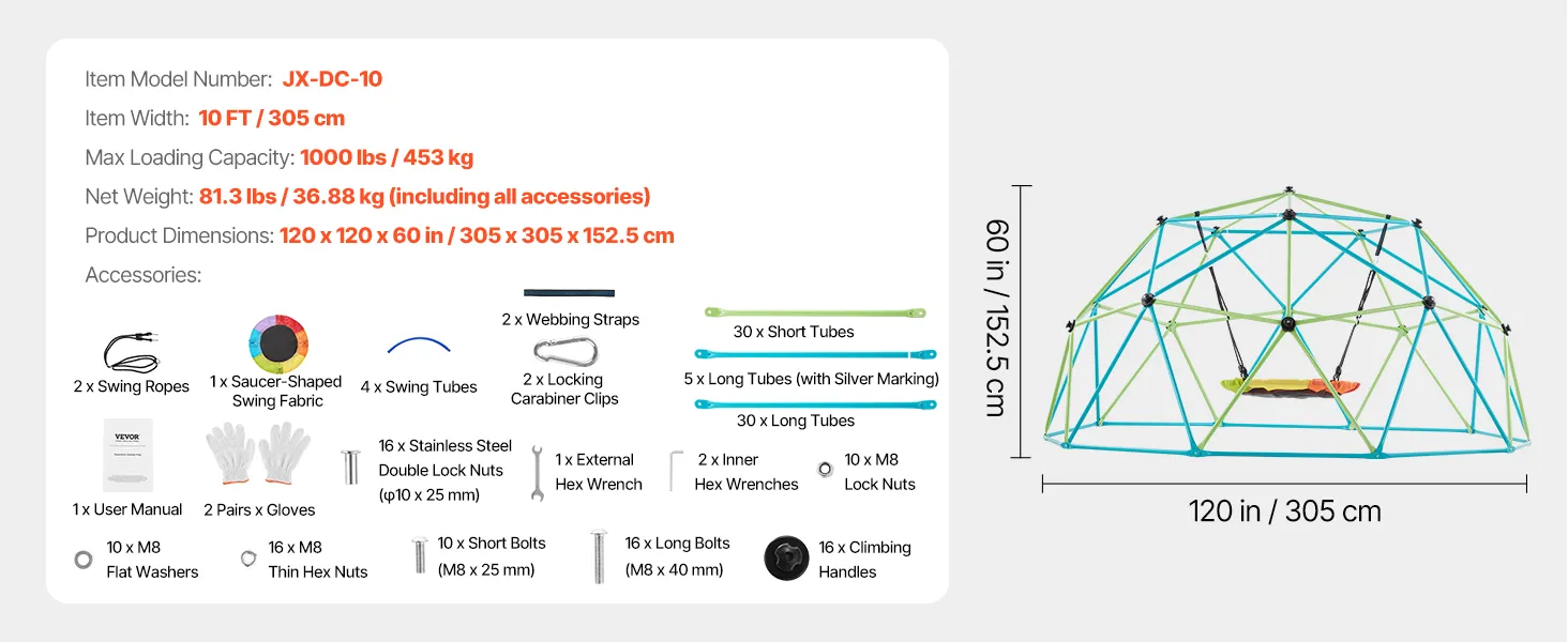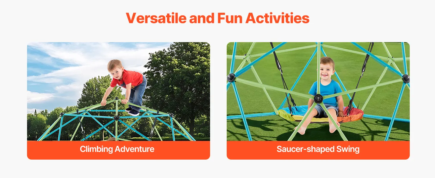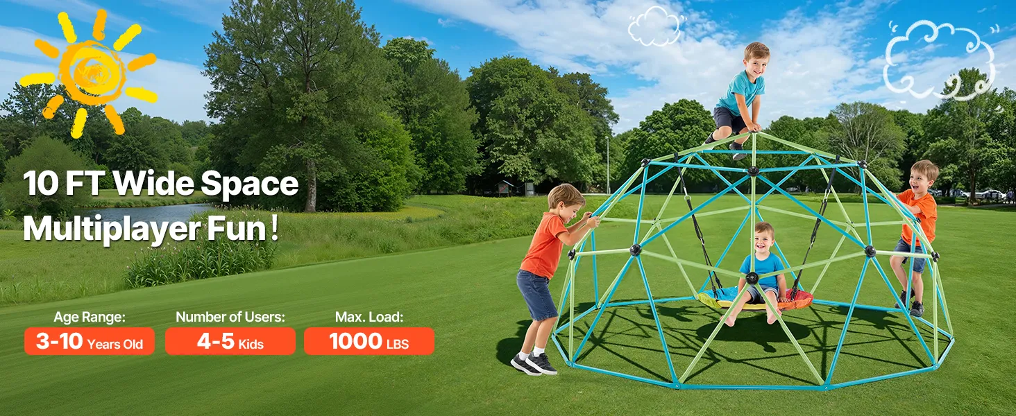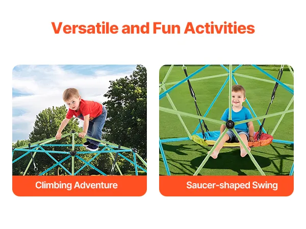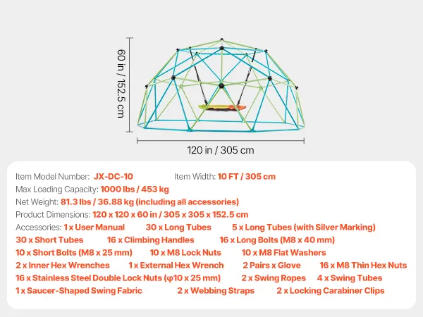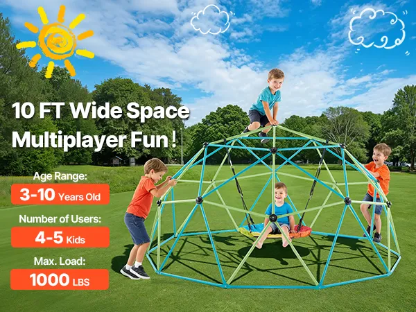 La nostra cupola da arrampicata larga 305 cm permette ai bambini di arrampicarsi, giocare, esplorare e sviluppare la propria forza. Grazie alla sua struttura robusta, ai tubi in acciaio rinforzati, alle maniglie antiscivolo, alla capacità di carico di 453 kg e all'altalena a forma di disco.