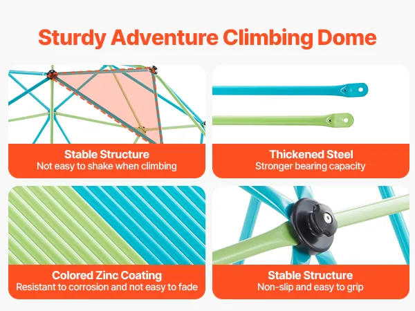 La nostra torre di arrampicata a cupola offre un'arrampicata sicura e divertente. I tubi in acciaio ispessiti aumentano la capacità di carico, il rivestimento in zinco colorato protegge da ruggine e scolorimento e le prese antiscivolo garantiscono una presa sicura.