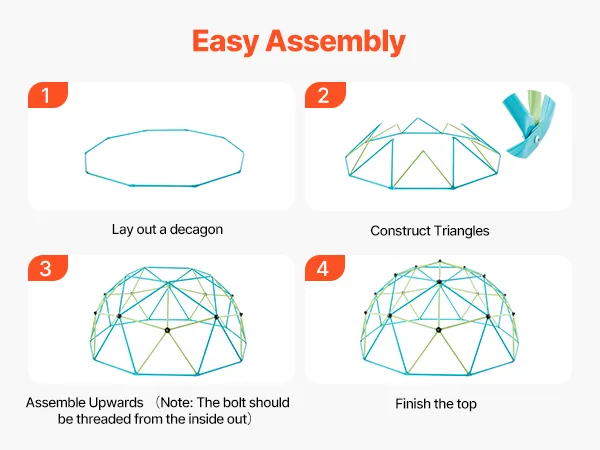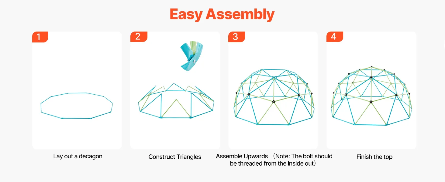 La nostra struttura geometrica per arrampicata viene fornita con guanti, chiavi e istruzioni dettagliate. Può essere montata da due persone in pochi passaggi e trasformerà il vostro giardino in un divertente parco giochi per i vostri bambini.