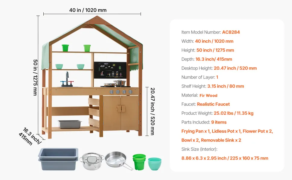 VEVOR Cucina di Fango per Bambini, Larghezza 1020 mm Set da Cucina Giocattolo in Legno con Accessori, Set da Gioco per Negozio di Alimentari per Bambini all'Aperto con Fornello, Fioriere, Rubinetto