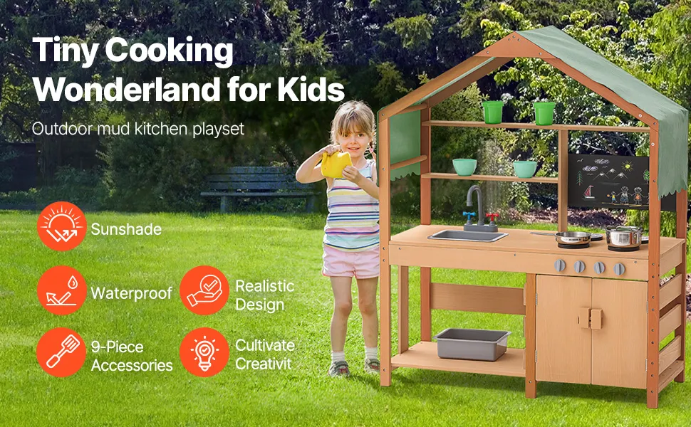 Questa cucina da gioco per bambini è trattata con vernice esterna per renderla resistente all'acqua e alla corrosione e fornisce un'area ombreggiata dove i bambini possono giocare. È perfetto per l'uso in giardini, cortili e prati.