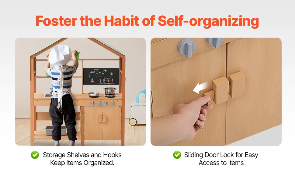 Promuovi l'indipendenza: la cucina da gioco all'aperto è dotata di versatili armadietti che offrono molto spazio e scaffali aperti in modo che i bambini possano sistemare le loro cose come desiderano