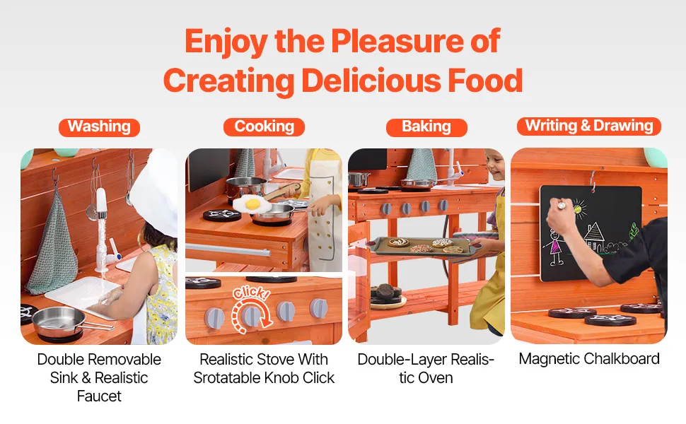 Design realistico della cucina giocattolo: I piccoli chef potranno scrivere e disegnare menu sulla lavagna magnetica, utilizzare i due lavelli rimovibili e il rubinetto estraibile per pulire i loro "piatti" (il rubinetto è compatibile con un normale tubo da giardino) e girare le manopole del fornello simulato per cucinare