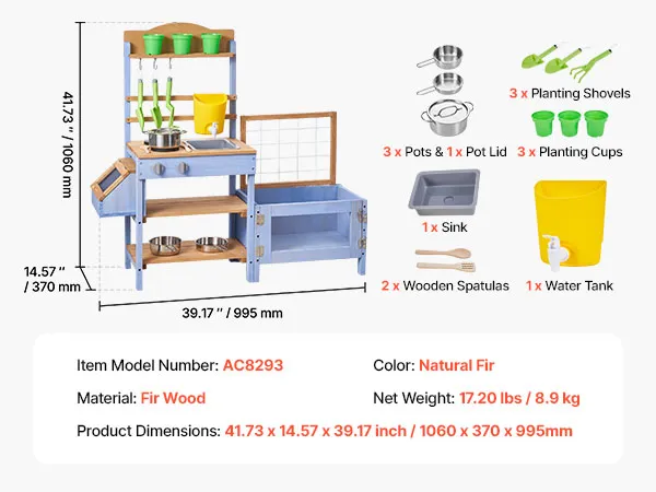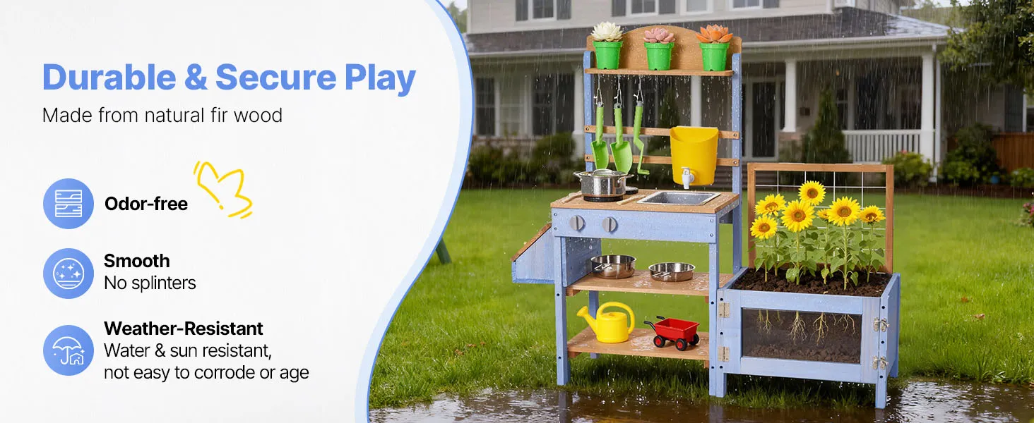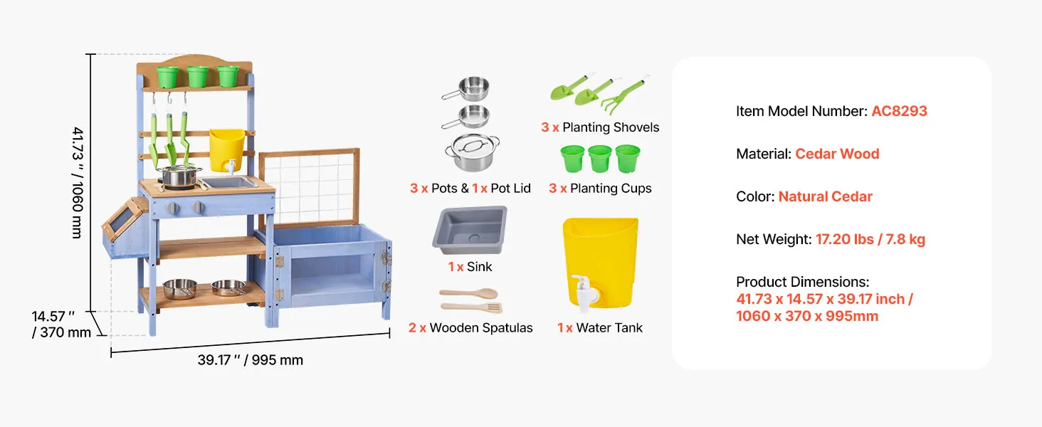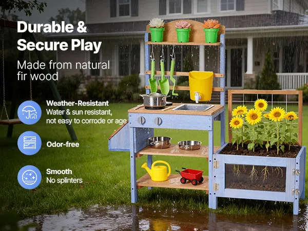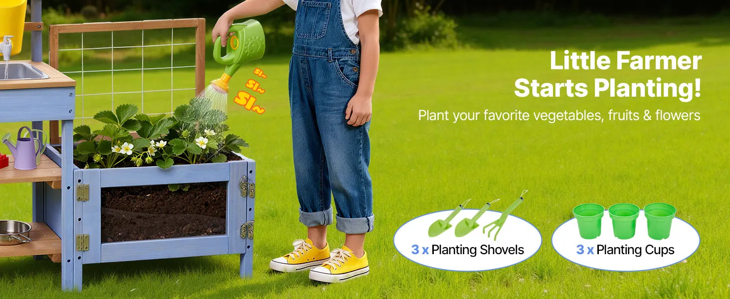 VEVOR Cucina in Legno con Piano di Cottura per Bambini, Cucine da Gioco in Legno con Fioriera, Contenitore per Animali, Vasca, Lavandino, Pentole, Pentole e Accessori, per Prato e Cortile