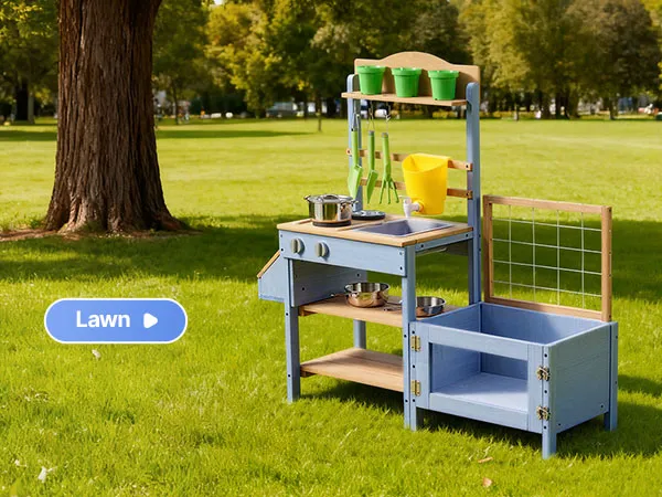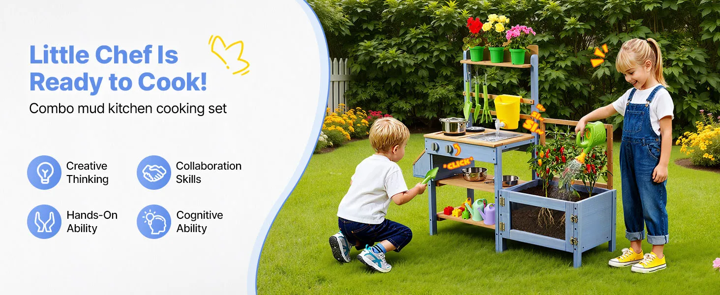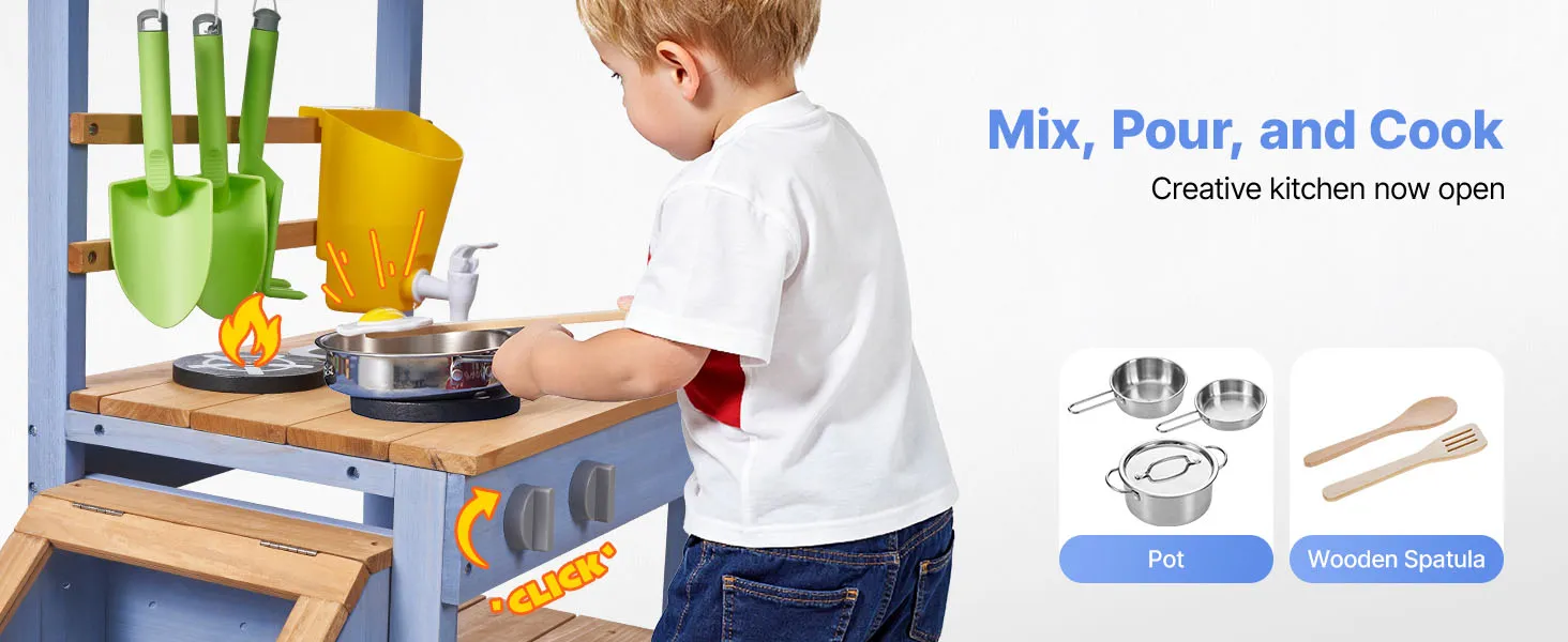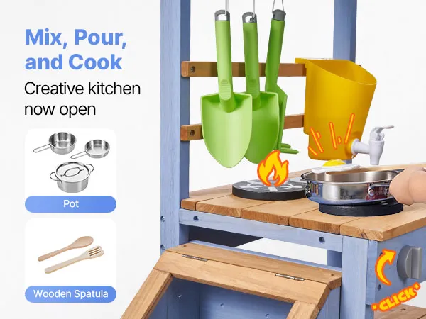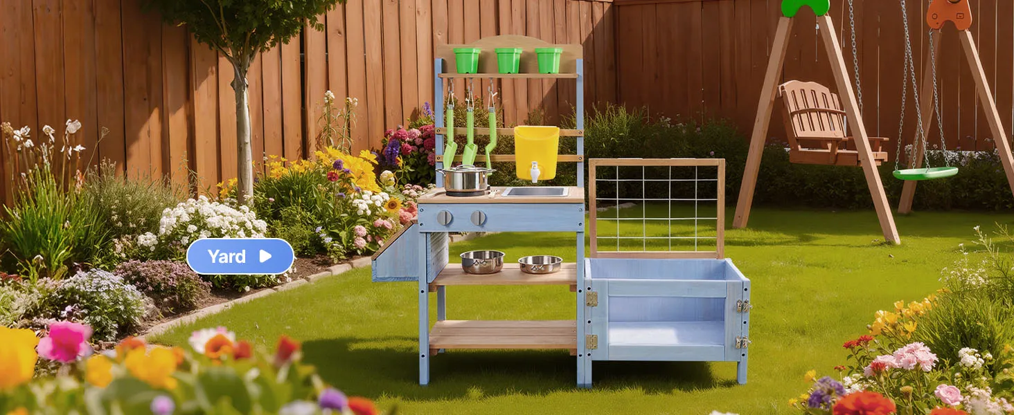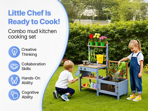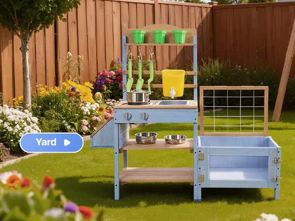 Questa cucina di fango per bambini è progettata per giocare all'aperto con fango, acqua e natura. Lascia che il tuo bambino esplori e cucini con la terra come un vero chef, stimolando la creatività e il divertimento fantasioso.