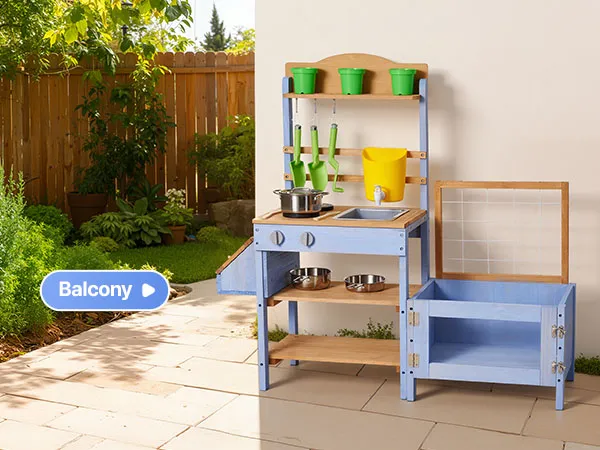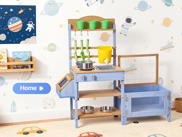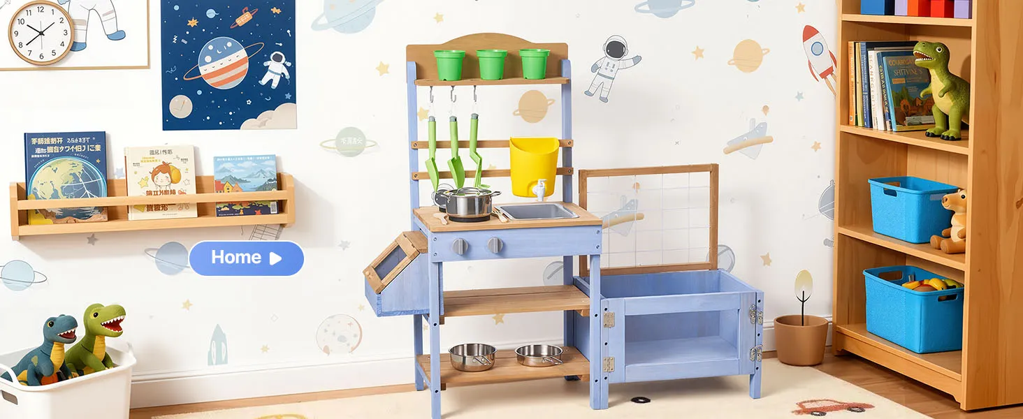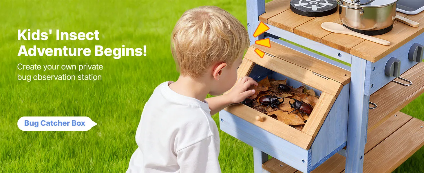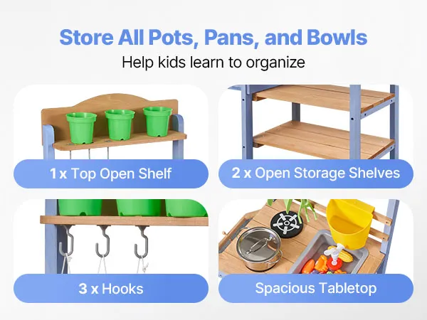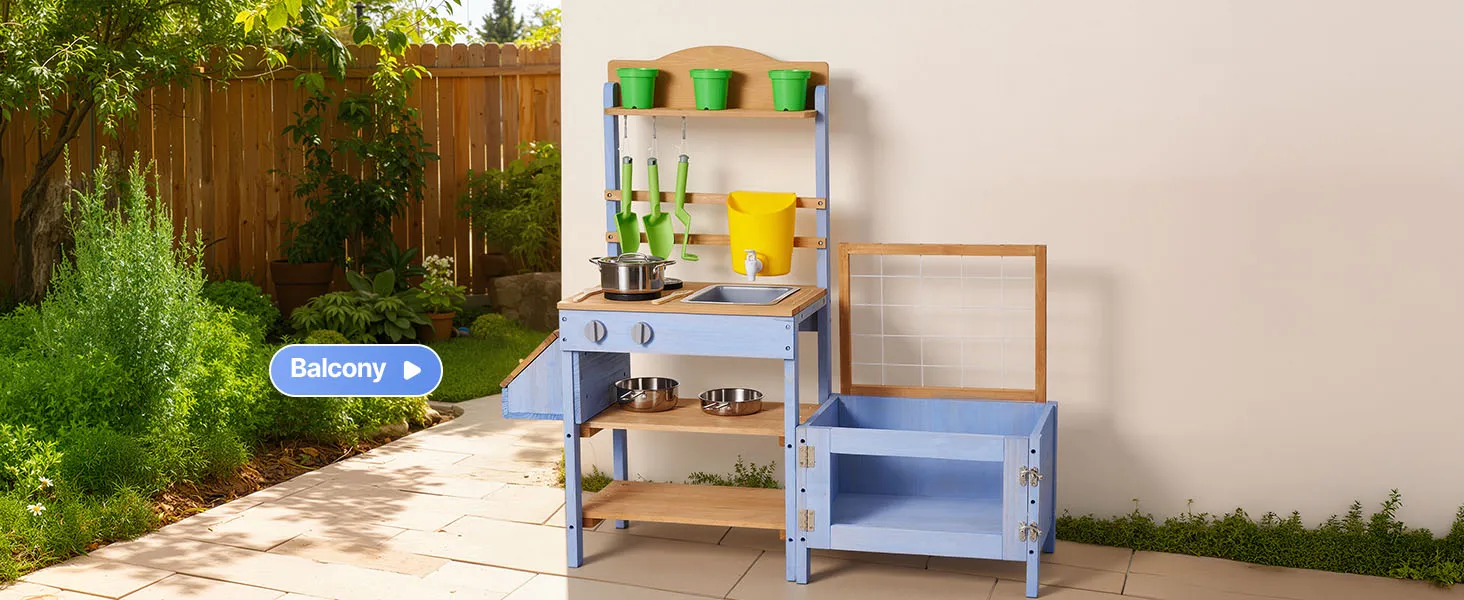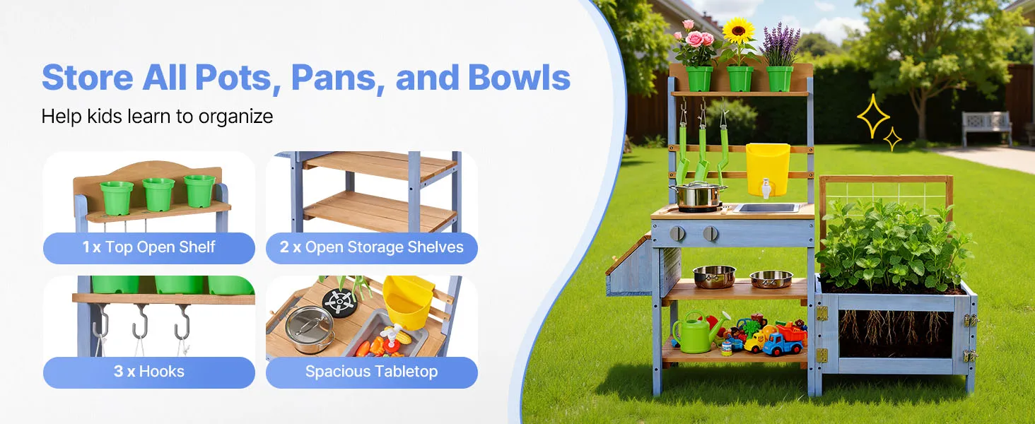 Questa cucina di fango per bambini è progettata per giocare all'aperto con fango, acqua e natura. Lascia che il tuo bambino esplori e cucini con la terra come un vero chef, stimolando la creatività e il divertimento fantasioso.