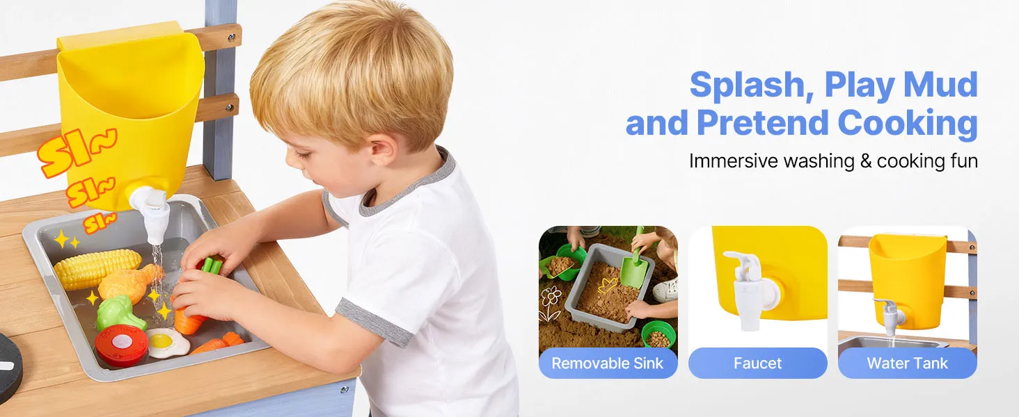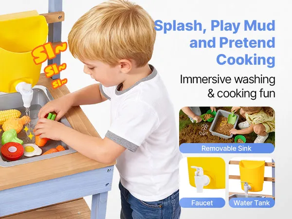 Serbatoio dell'acqua e lavandino rimovibile: la nostra cucina di fango è dotata di un serbatoio d'acqua compatto con rubinetto per giocare con l'acqua, irrigare e pulire. Incoraggia le capacità motorie fini, lo sviluppo sensoriale