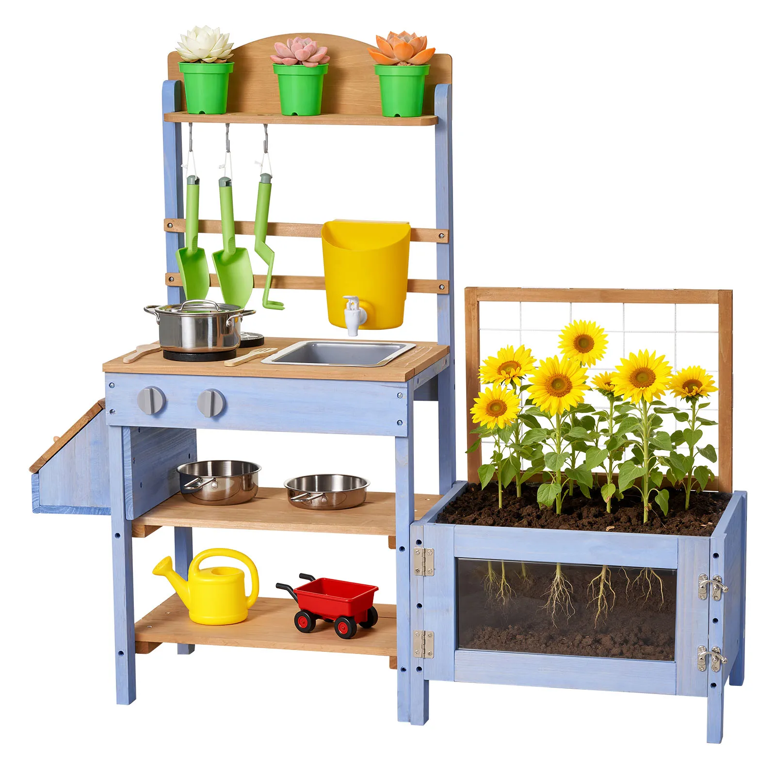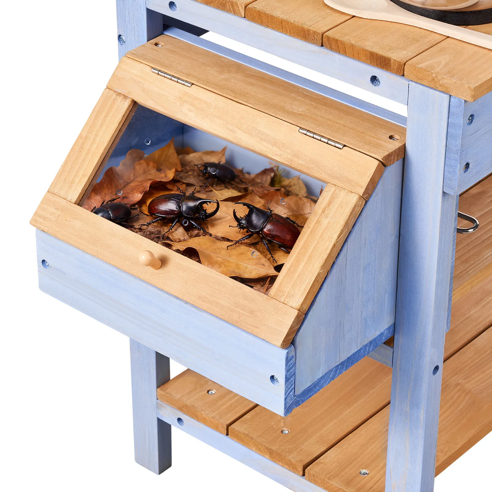 Piantagione e osservazione complete: questa cucina da esterno per bambini in fango include una fioriera da 445 x 310 x 230 mm e un contenitore per animali da 260 x 180 x 174 mm. Crea un mini laboratorio naturalistico in cui