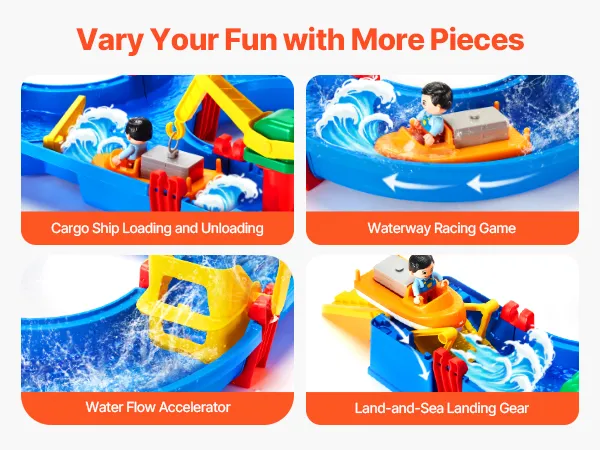 Questo set da gioco per bambini piccoli è dotato di una varietà di accessori entusiasmanti, tra cui un acceleratore di flusso d'acqua, un carrello di atterraggio terra-mare, un cancello d'acqua, ecc., che consentono ai bambini di dare sfogo alla loro creatività.