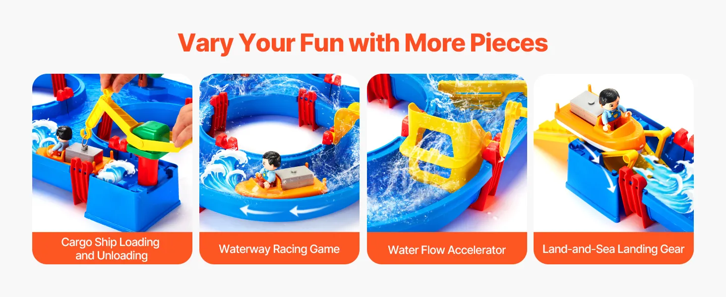 Divertimento senza fine con l'acqua: il tavolo d'acqua per bambini VEVOR è dotato di 39 accessori ricchi, tra cui acceleratore di flusso d'acqua, carrello di atterraggio terra-mare, cancello d'acqua, banchine, container per merci, ecc