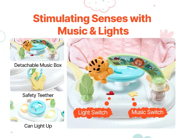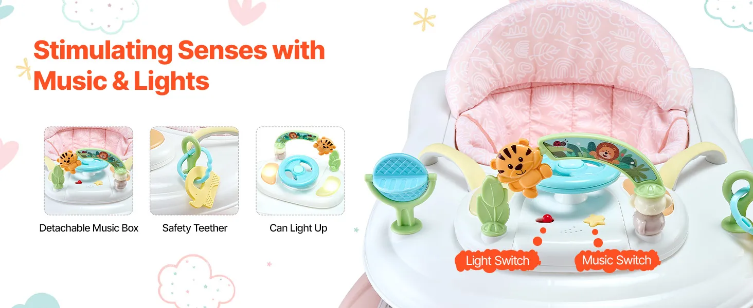 Giocattoli interattivi e giocosi: non solo un girello, ma anche divertente centro attività. Include un carillon staccabile che stimola lo sviluppo sensoriale, un mulino a vento e giocattoli per la dentizione che aiutano a sviluppare coordinazione