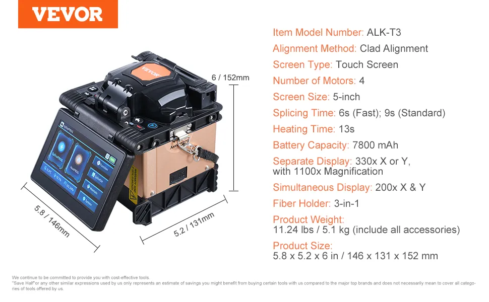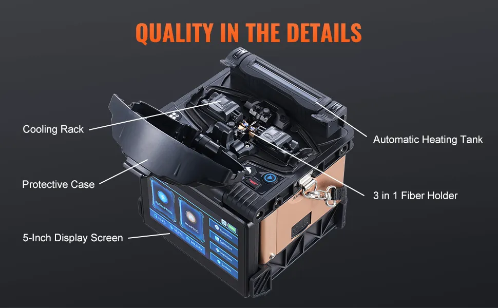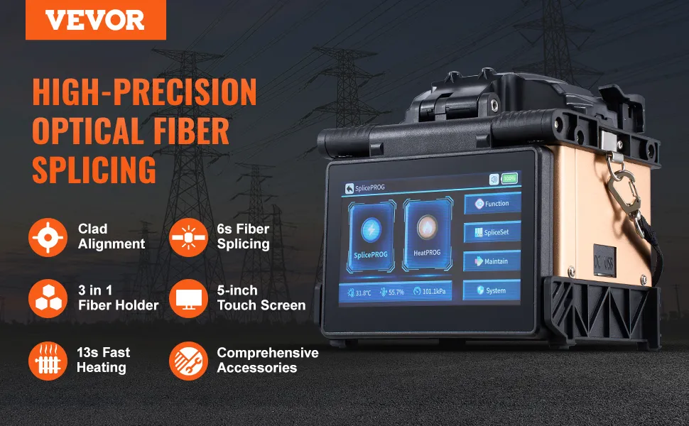 Dotato di tecnologia di allineamento clad, 4 motori ad alta precisione, supporto fibra 3 in 1, lo splicer per fusione di fibra VEVOR assicura una giunzione rapida in soli 6 secondi e un riscaldamento rapido in 13 secondi.