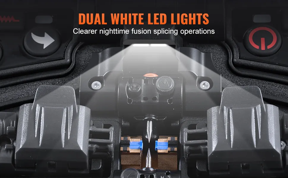 Le doppie luci LED integrate forniscono un'illuminazione eccellente, questa giuntatrice ottica a fusione consente un allineamento preciso delle fibre anche in condizioni di scarsa illuminazione o all'aperto. Opera con sicurezza, indipendentemente dalla situazione di illuminazione.