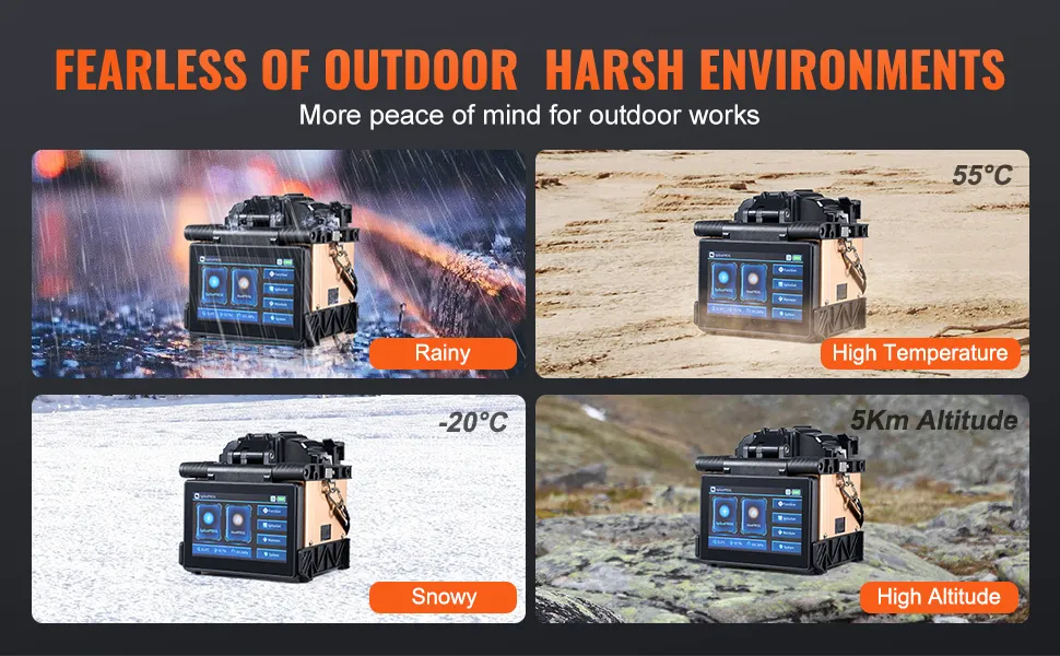 Robusto e durevole: la nostra superficie di giunzione a fusione in fibra ottica è realizzata in robusto materiale ABS e PC, leggero, compatto e durevole. È antipolvere, infrangibile e antiurto, adatto a climi secchi, tempeste di neve, altitudini elevate e ambienti ad alta temperatura.