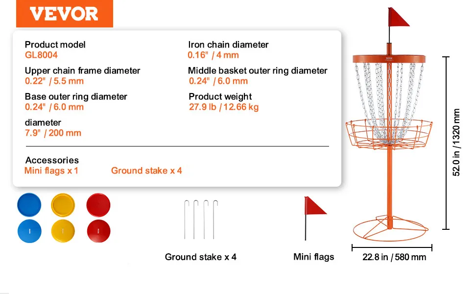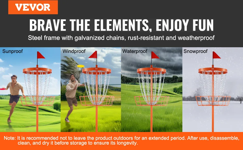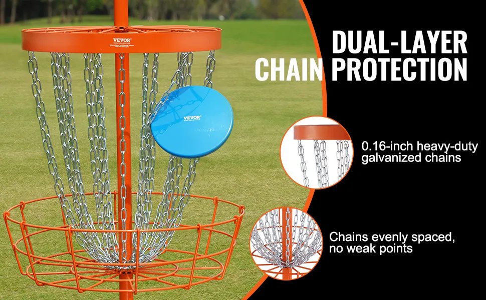 Il cestino da disc golf VEVOR presenta un design accattivante e duraturo. Il colore arancione brillante aggiunge un tocco di colore alla tua area di pratica. Le sue 24 catene ti forniscono meccanismi di cattura affidabili. Garantiscono che i tuoi dischi vengano catturati in modo sicuro, riducendo il rischio di tiri mancati. Queste catene sono resistenti e durevoli e possono resistere all'uso regolare. Il design è sia funzionale che esteticamente gradevole. È costruito per durare, offrendo valore a lungo termine. Quindi, questo lo rende un'aggiunta incredibilmente utile a qualsiasi attrezzatura da disc golf.