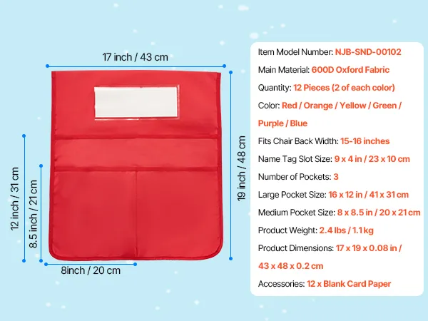 Set di 12 tasche per schienale sedia: 12 tasche colorate per sedia in rosso, arancione, giallo, verde, viola e blu, 2 per ogni colore. Include 12 targhette identificative sostituibili, ideali per la scuola primaria e secondaria di primo grado