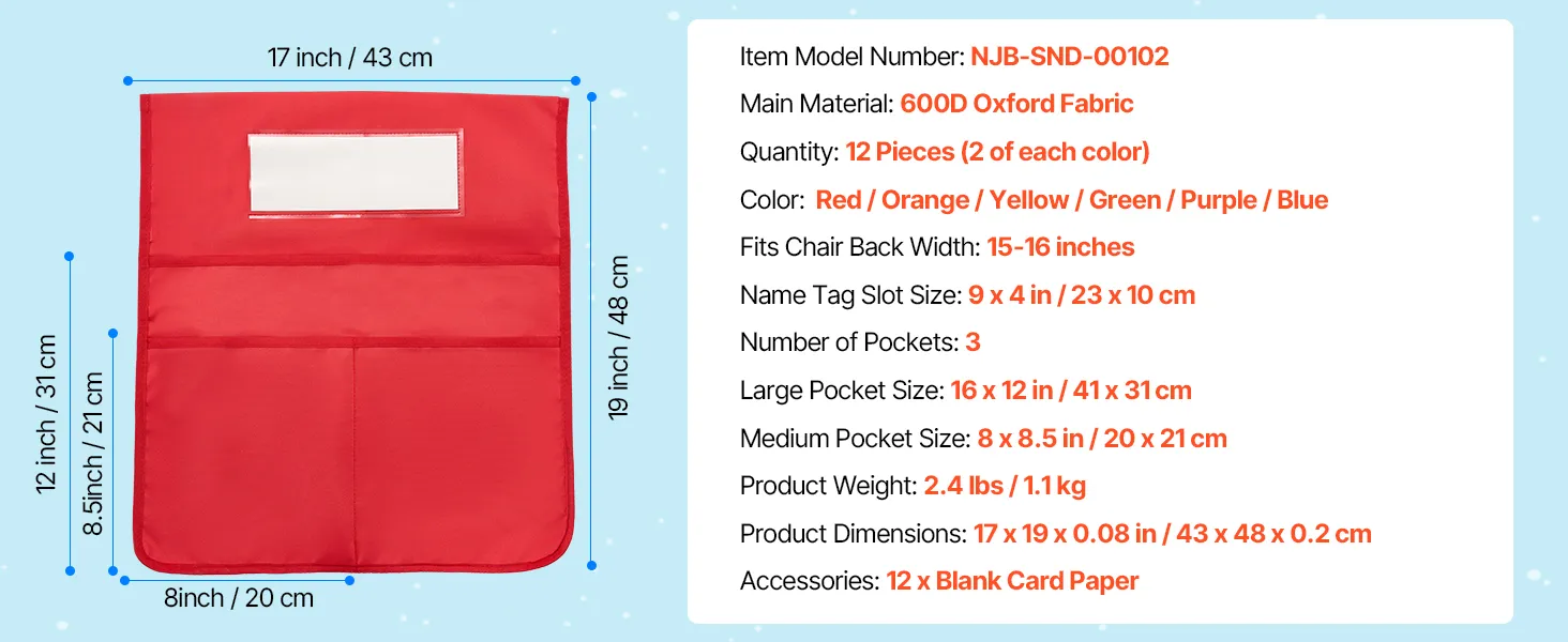 Mantieni la scrivania in ordine con la nostra tasca portaoggetti per schienale. Il set da 12 pezzi è adatto per le aule scolastiche ed è un'ottima idea regalo. Adatto a sedie da 15 - 16 pollici/ca. 381 - 406,4 mm, ideale per studenti dalla prima alla dodicesima classe per mantenere l'ordine.
