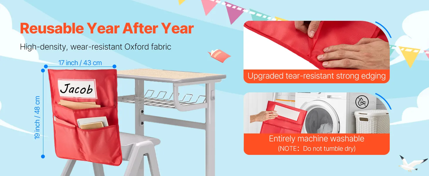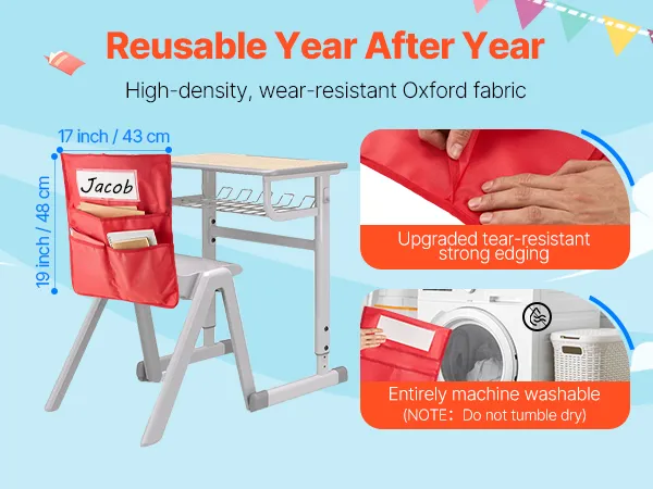 La tasca per sedia da studente è realizzata in tessuto Oxford 600D ad alta densità e con bordi rinforzati per una maggiore durata. Lavabile in lavatrice: può essere utilizzata più e più volte senza usurarsi.