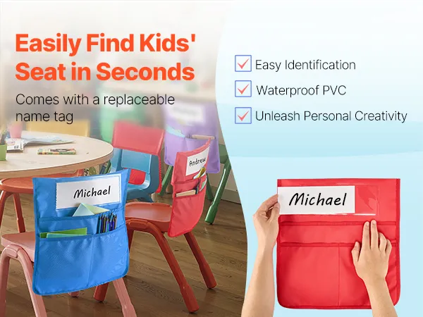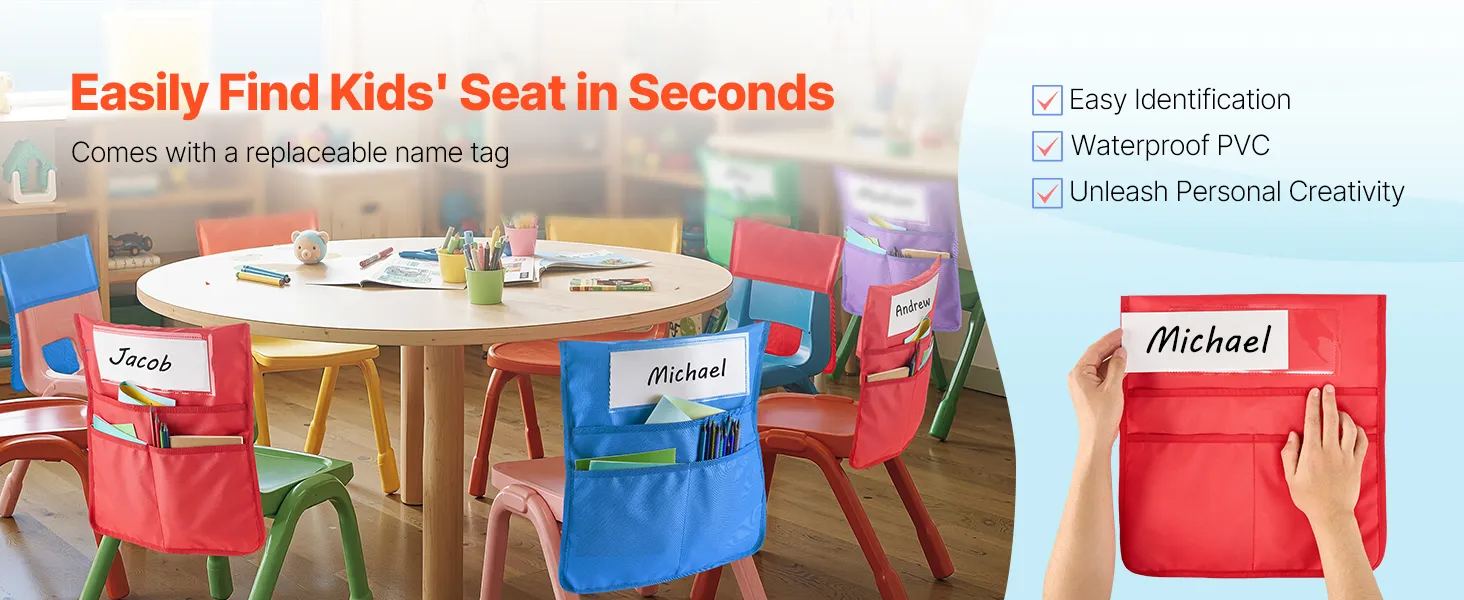 La nostra tasca porta-targhette per sedie in classe include uno spazio in PVC trasparente per il nome, per una facile personalizzazione. Lasciate che i bambini disegnino le proprie targhette e rendiate l'esperienza in classe più divertente e personalizzata.