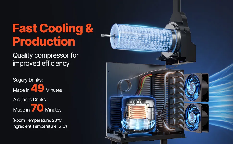 La macchina per il ghiaccio migliorata offre un intervallo di regolazione della temperatura compreso tra 5 e 50 ℉ / -15 e 10 ℃, rendendola adatta a una varietà di bevande, tra cui succhi, caffè freddo, tè e persino margarita.