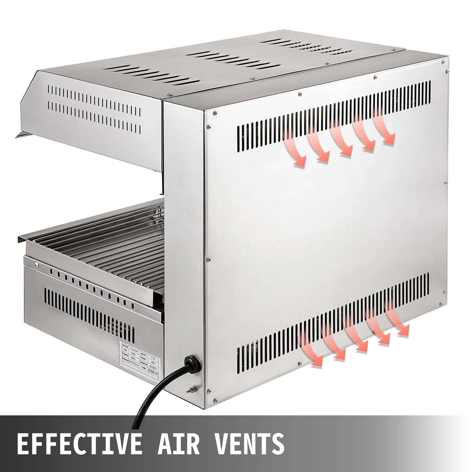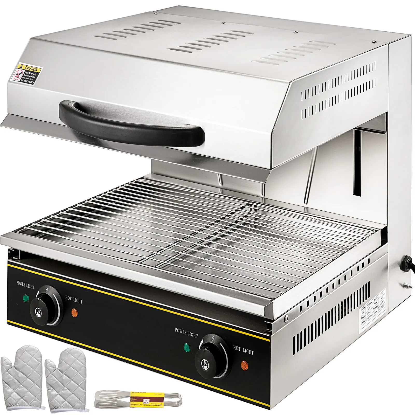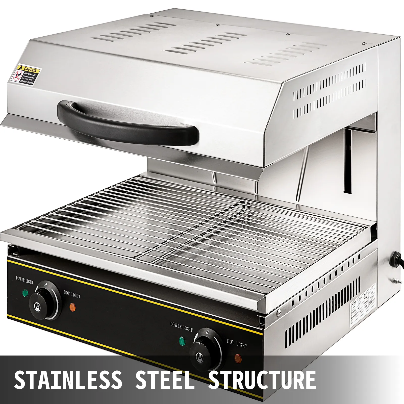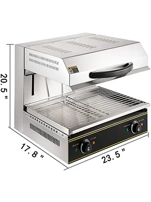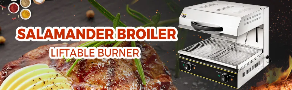 Questa macchina per la fusione del formaggio è realizzata in acciaio inossidabile addensato con superficie spazzolata, resistente alla corrosione e durevole. Con bruciatori sollevabili e pulsanti rotanti, la temperatura è regolabile tra 50 e 300°C. Questa salamandra commerciale è in grado di cucinare vari tipi di alimenti, tra cui formaggi, panini, carne, ecc.