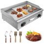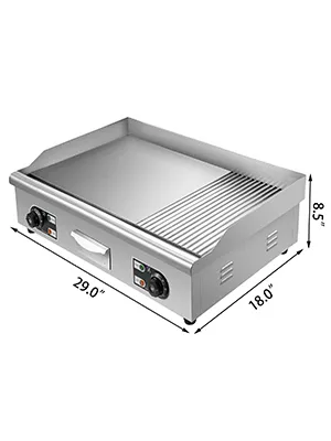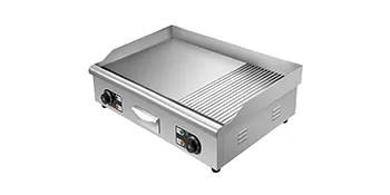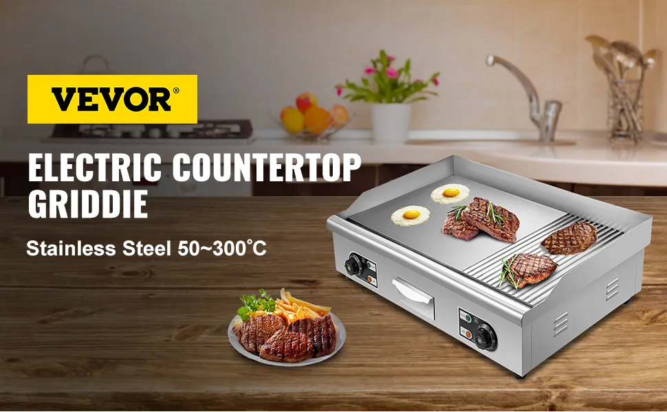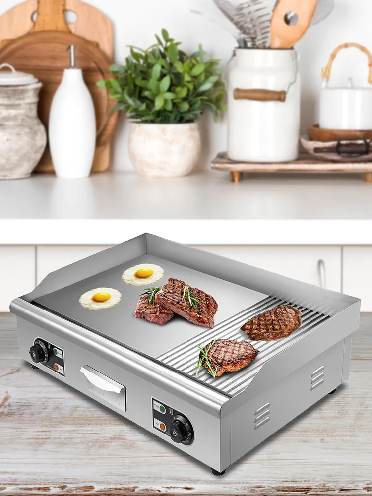 Questa piastra da appoggio adotta il design combinato griglia e piastra, perfetto per cucinare verdure, polli, pesce, bistecca, calamari, formaggio grigliato, pancake, uova strapazzate, ecc. 2 manopole rotanti lisce consentono il controllo separato della temperatura, per cucinare diversi cibi crudi materiali. Funzionamento facile, ottimo sia per uso domestico che commerciale.
