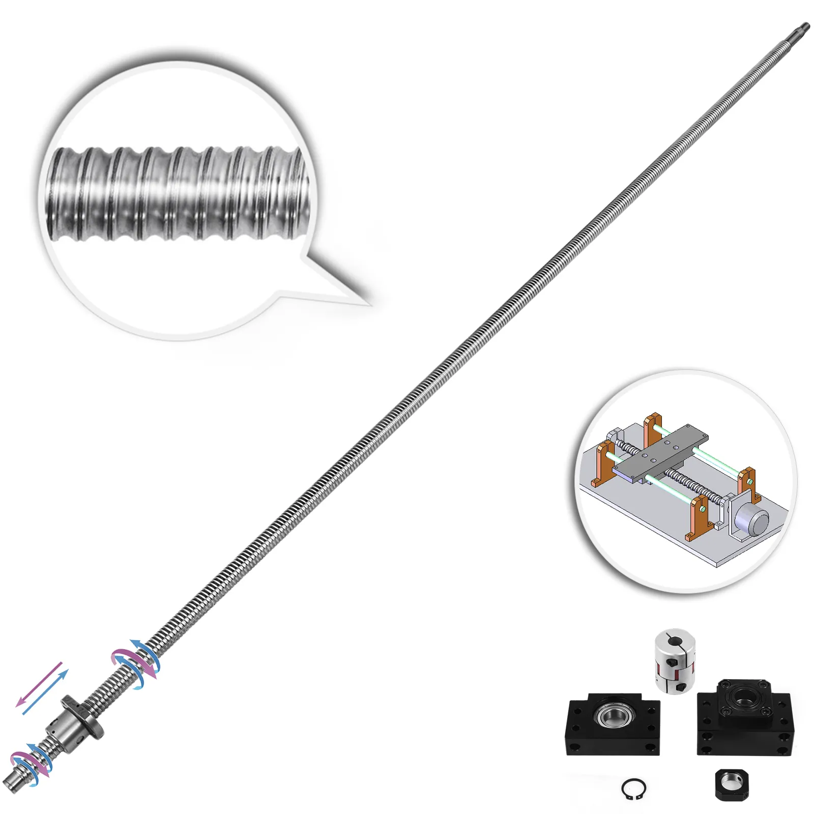 Il gruppo vite a ricircolo di sfere è composto da un albero, un dado e lati di supporto BK / BF20. L'inversore a sfera è realizzato in acciaio di qualità, che resiste all'usura e soddisfa i requisiti di elevata capacità di carico.