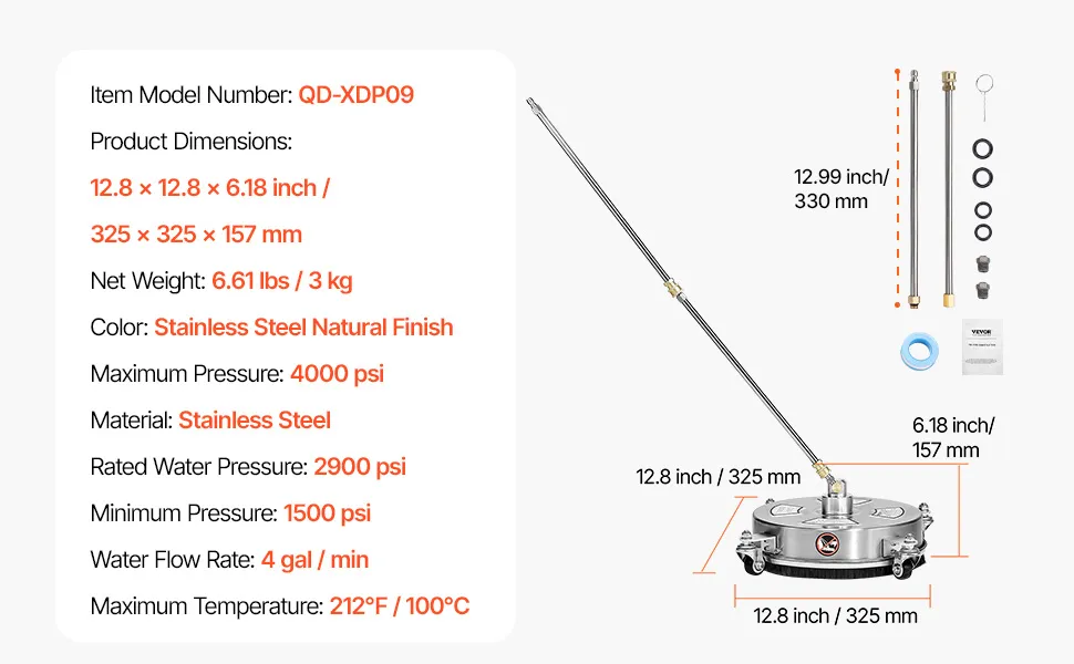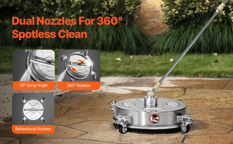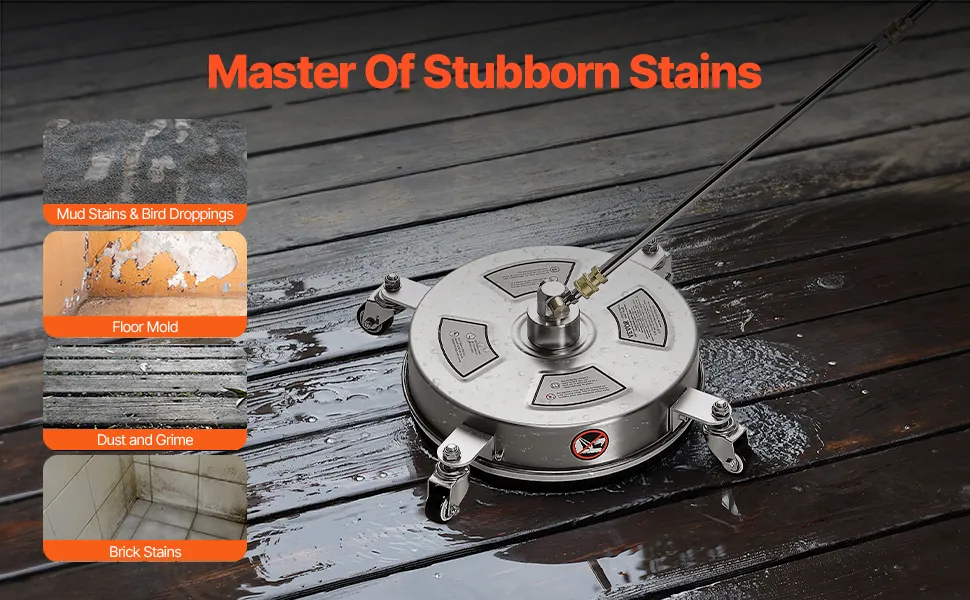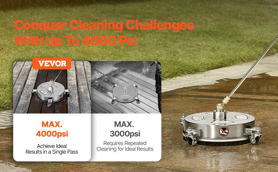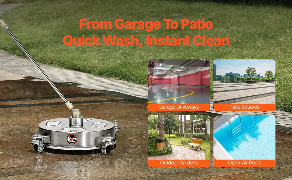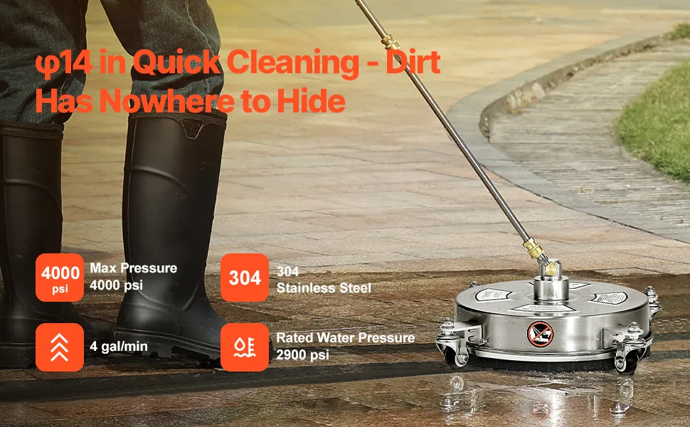 Pulizia rapida ed efficiente da φ14 pollici: con un'elevata portata di 4 gal/min, questa idropulitrice per superfici da φ14 pollici assicura una copertura uniforme, senza lasciare macchie. Che si tratti di un compito impegnativo o di una pulizia regolare, rende il lavoro facile. Goditi una pulizia efficiente risparmiando tempo e fatica