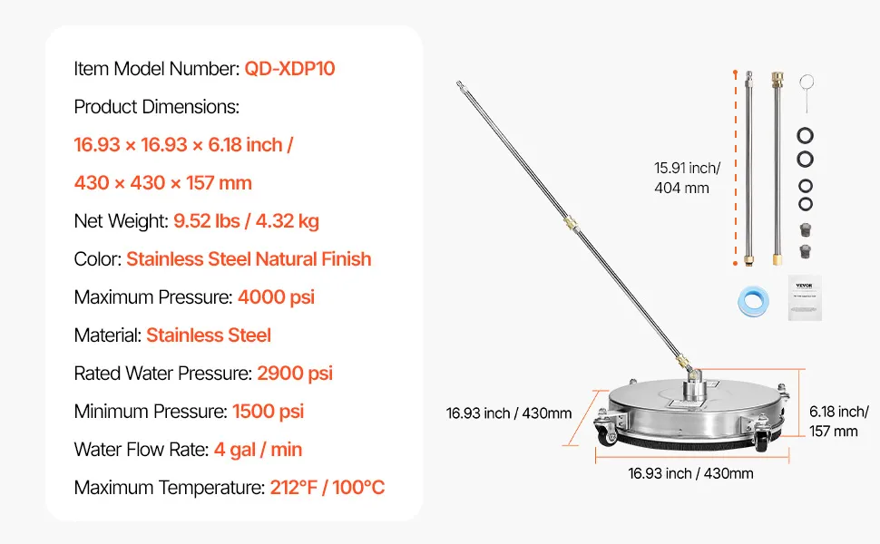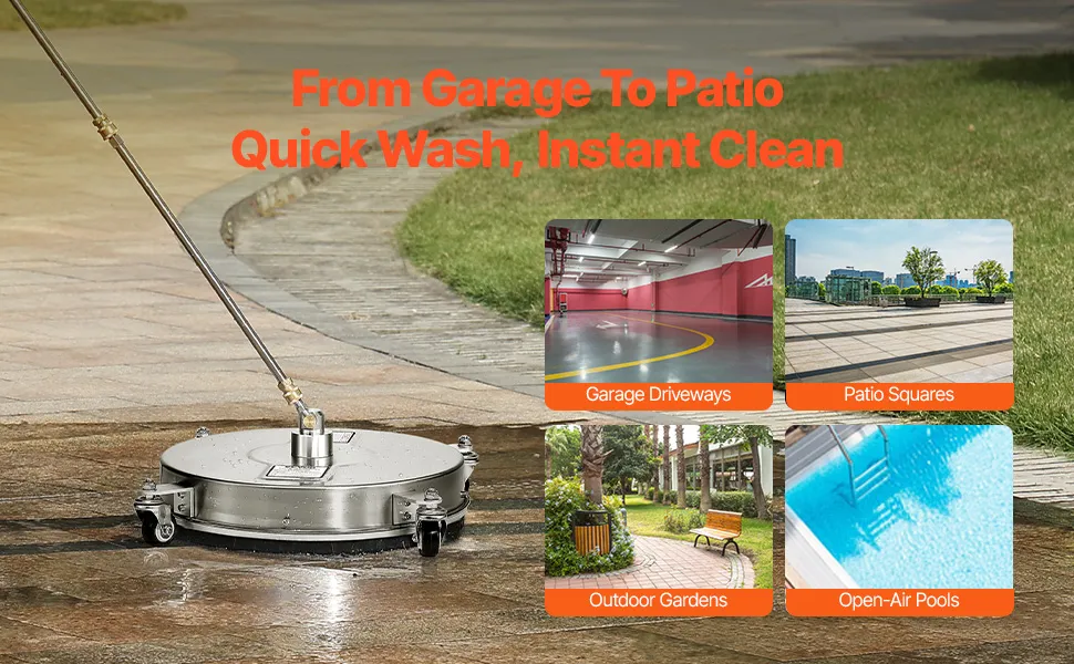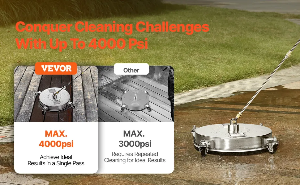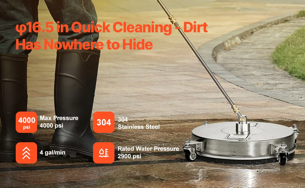 φ16.5 pollici Pulizia rapida ed efficiente: con un'elevata portata di 4 gal/min, questa idropulitrice per superfici da φ16.5 pollici assicura una copertura uniforme, senza lasciare macchie. Che si tratti di un compito impegnativo o di una pulizia regolare, rende il lavoro facile. Goditi una pulizia efficiente risparmiando tempo e fatica