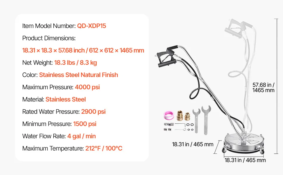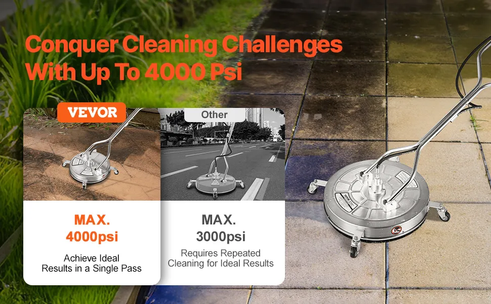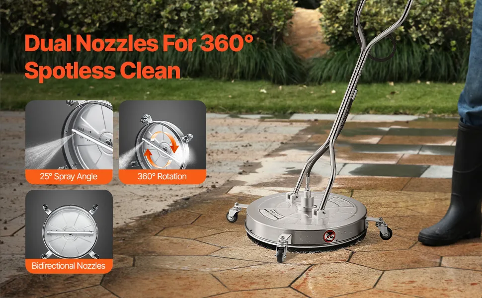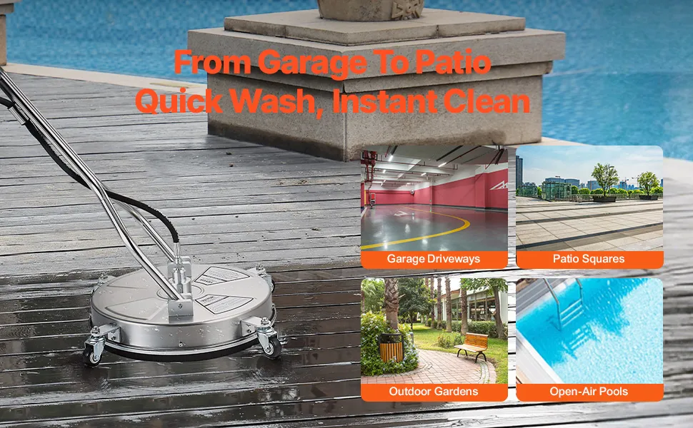 φ18 pollici Rapido ed efficiente: pulisci di più, più velocemente. Con una potente portata di 4 gal/min, questa idropulitrice per superfici da φ18 pollici pulisce ogni centimetro, rendendola ideale sia per grandi lavori che per la pulizia quotidiana. Porta a termine il lavoro in modo rapido e senza sforzo, risparmiando tempo ed energia